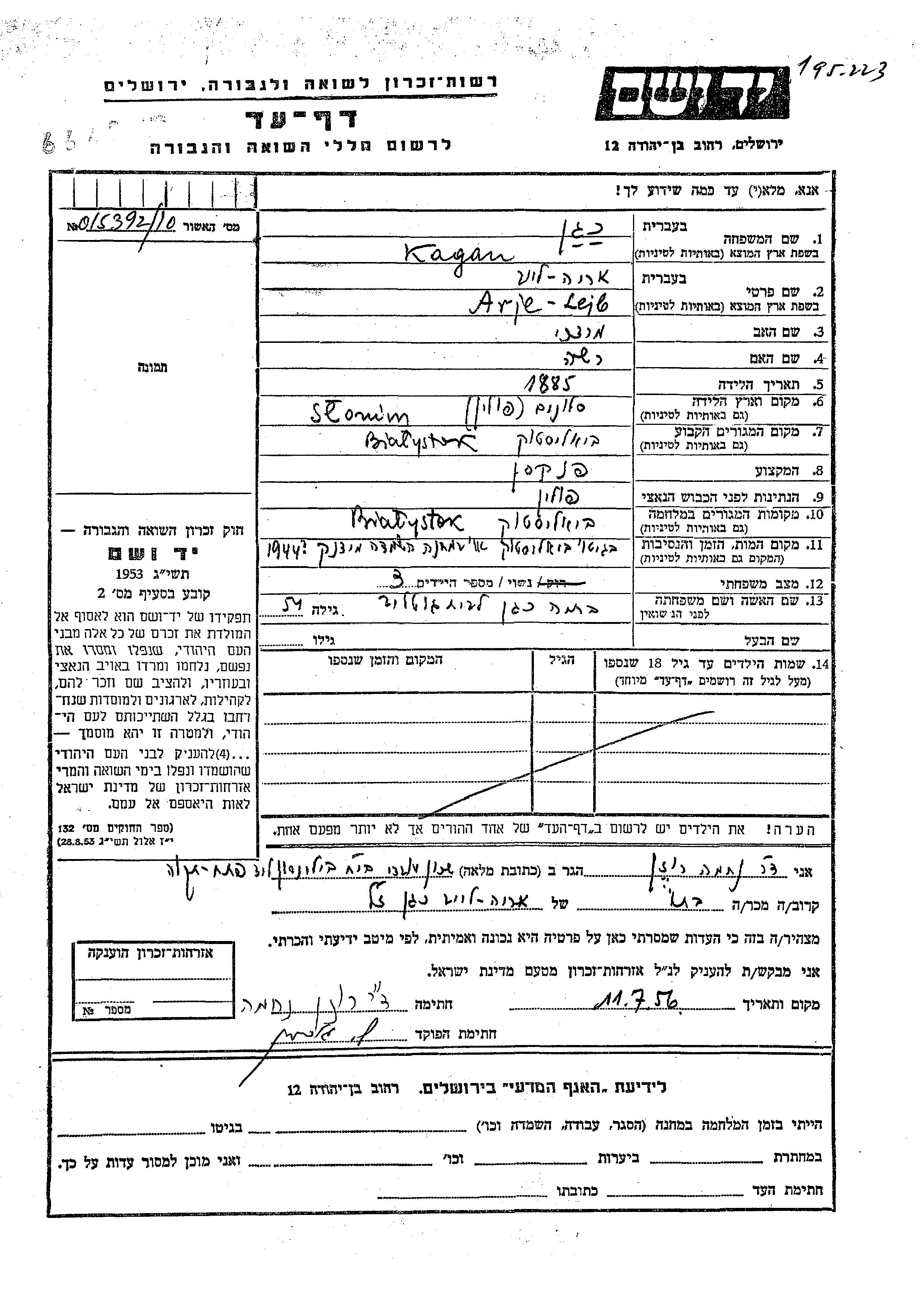 Арье Лейб Каган, место рождения: Слоним, Польша. Отец: Мордехай, mать:Раша. Бухгалтер / счетовод. Женат / замужем. Место жительства до войны: Белосток, Польша. Место во время войны: Белосток, Польша.