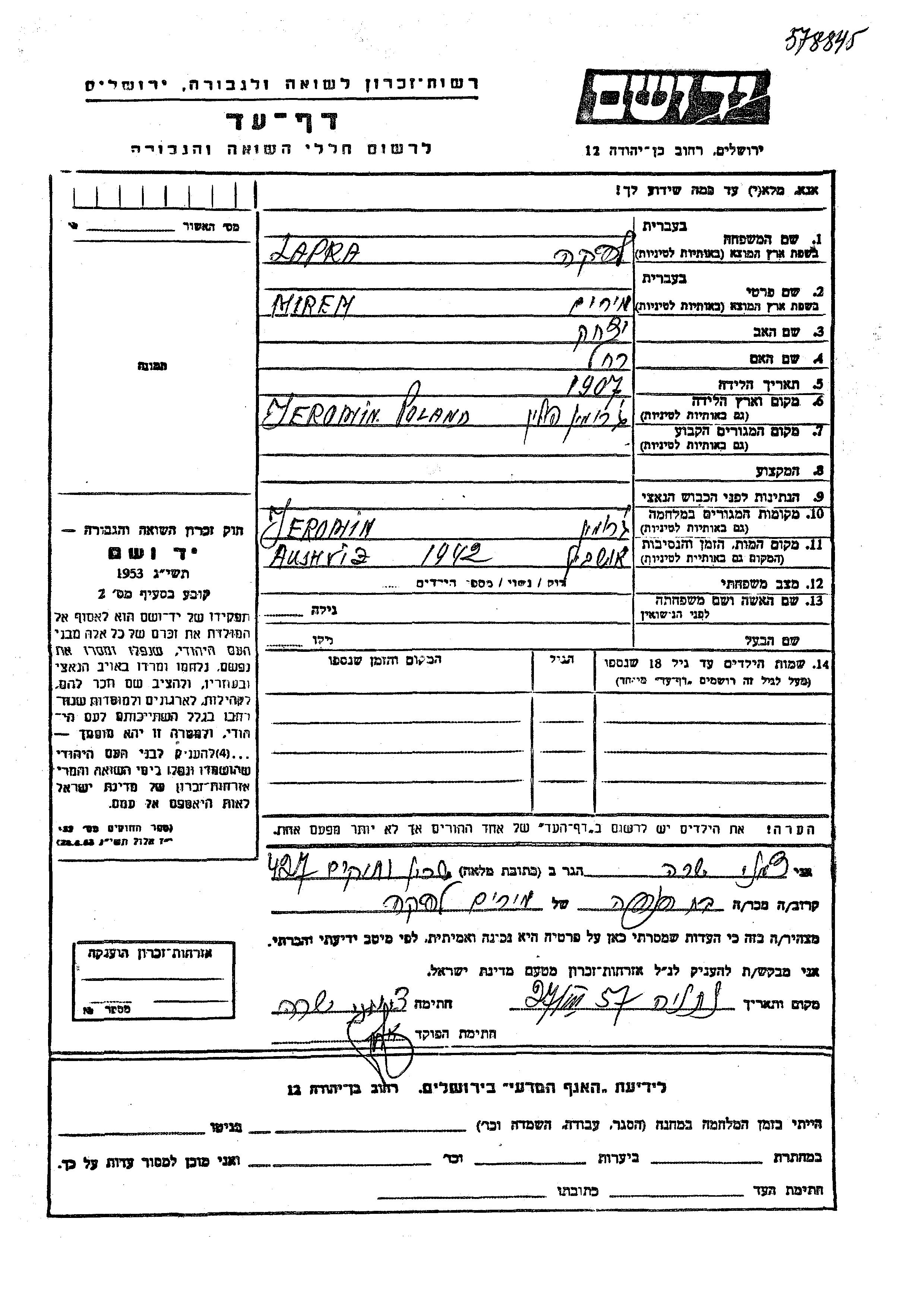 Мирем Лапка, место рождения: Журомин, Польша. Отец: Ицхак, mать:Рахель. Место во время войны: Журомин, Польша.