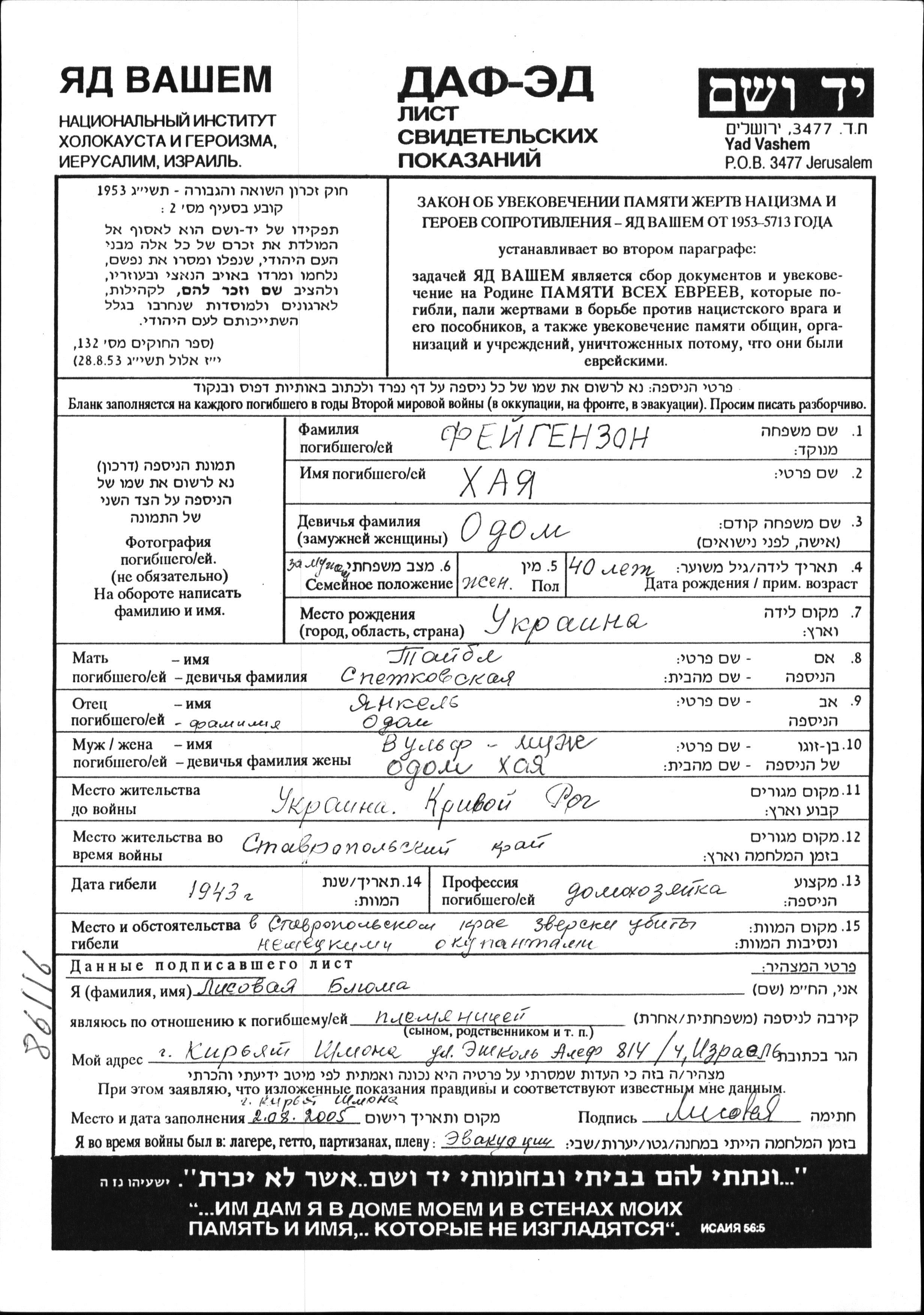 Файгинзон Хая Кривой Рог, Украина (СССР) Лист свидетельских показаний