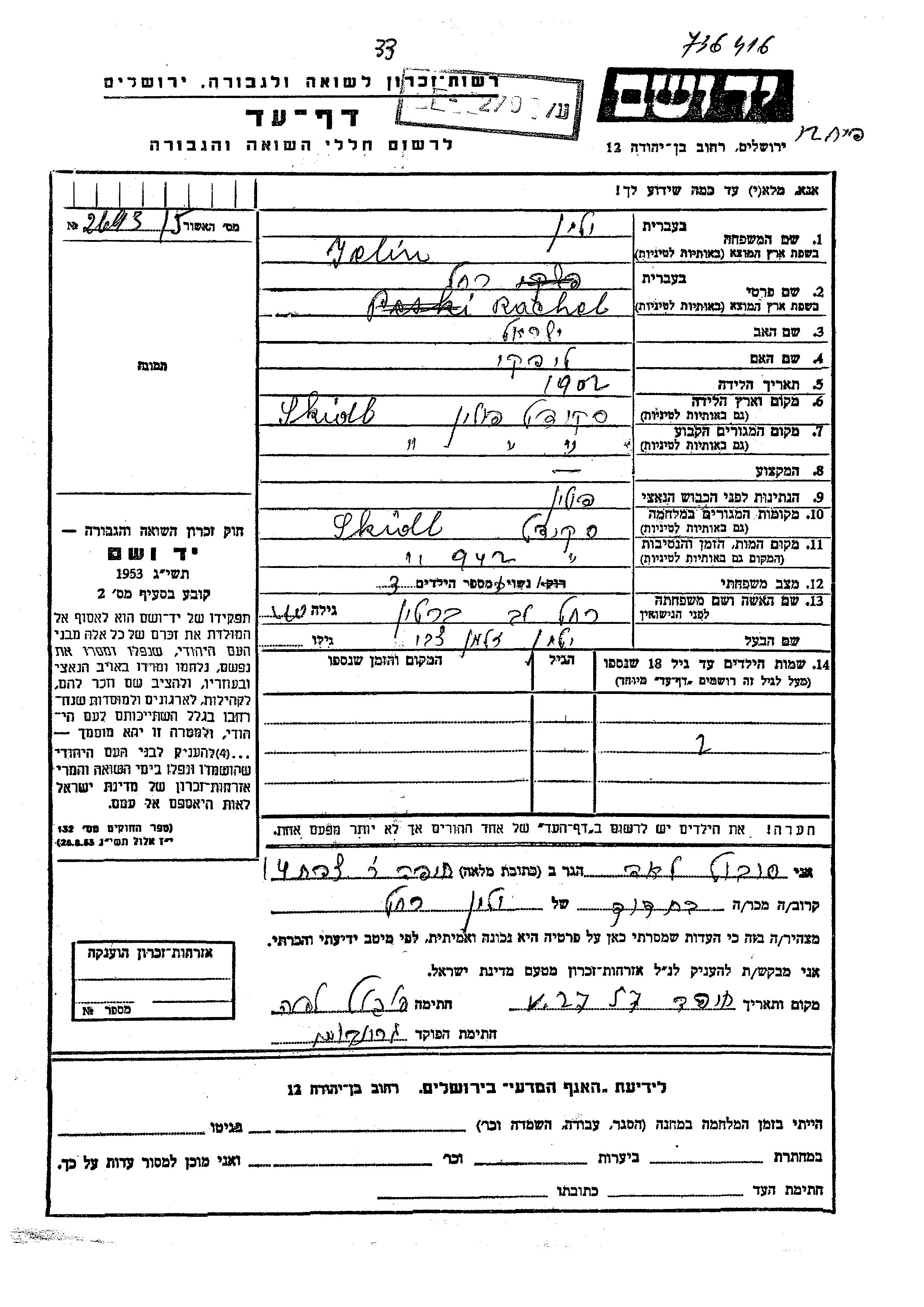 Елин Рахель 1902 Скидель, Польша Лист свидетельских показаний