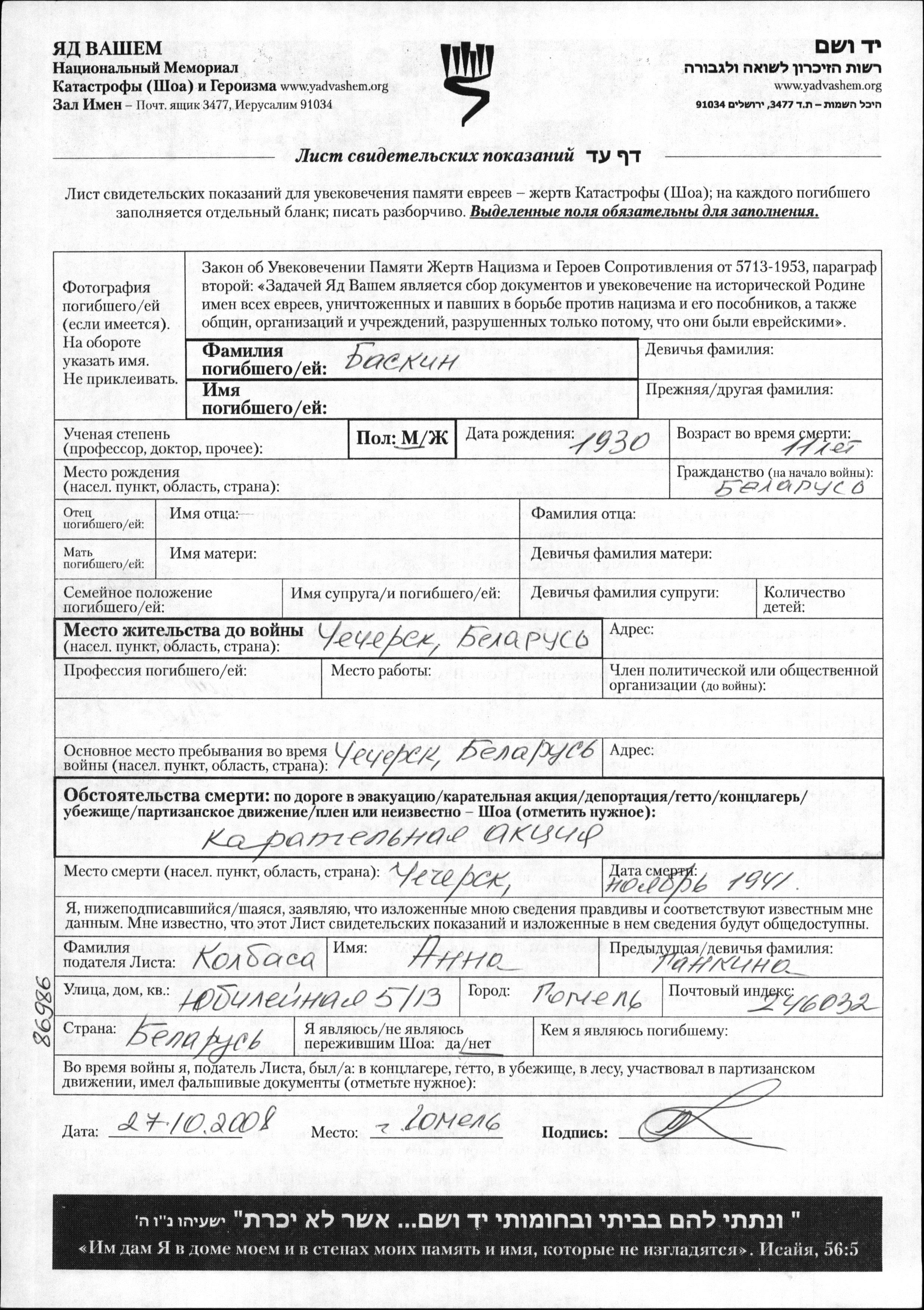 Баскин Имя неизвестно 1930 Чечерск, Белоруссия (СССР) Лист свидетельских показаний