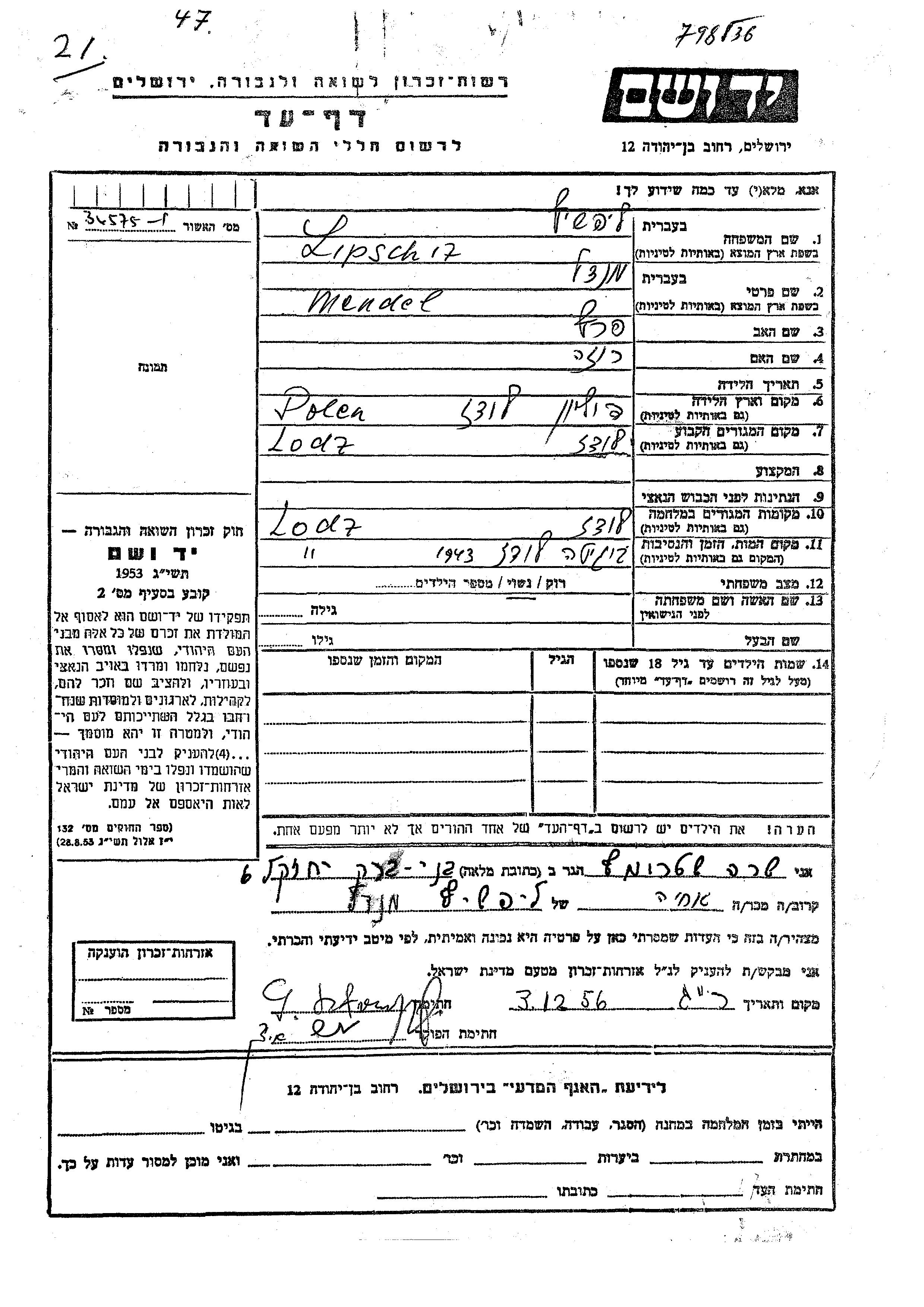 Мендель Липшиц, место рождения: Лодзь, Польша. Отец: Перец, mать:Роза. Женат / замужем. Место жительства до войны: Лодзь, Польша. Место во время войны: Лодзь, Польша.