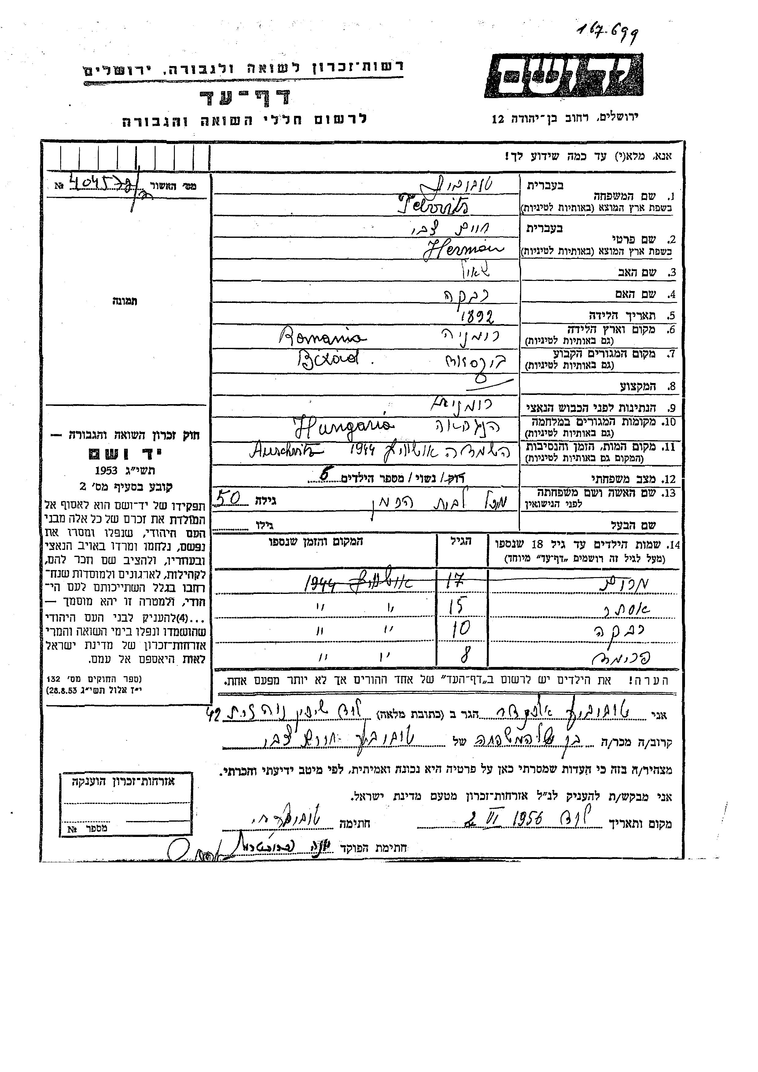 Херман Хаим Цви Тобовиц, место рождения: Румыния. Отец: Шауль, mать:Ривка. Женат / замужем. Место жительства до войны: Биксад, Румыния. Место во время войны: Венгрия.