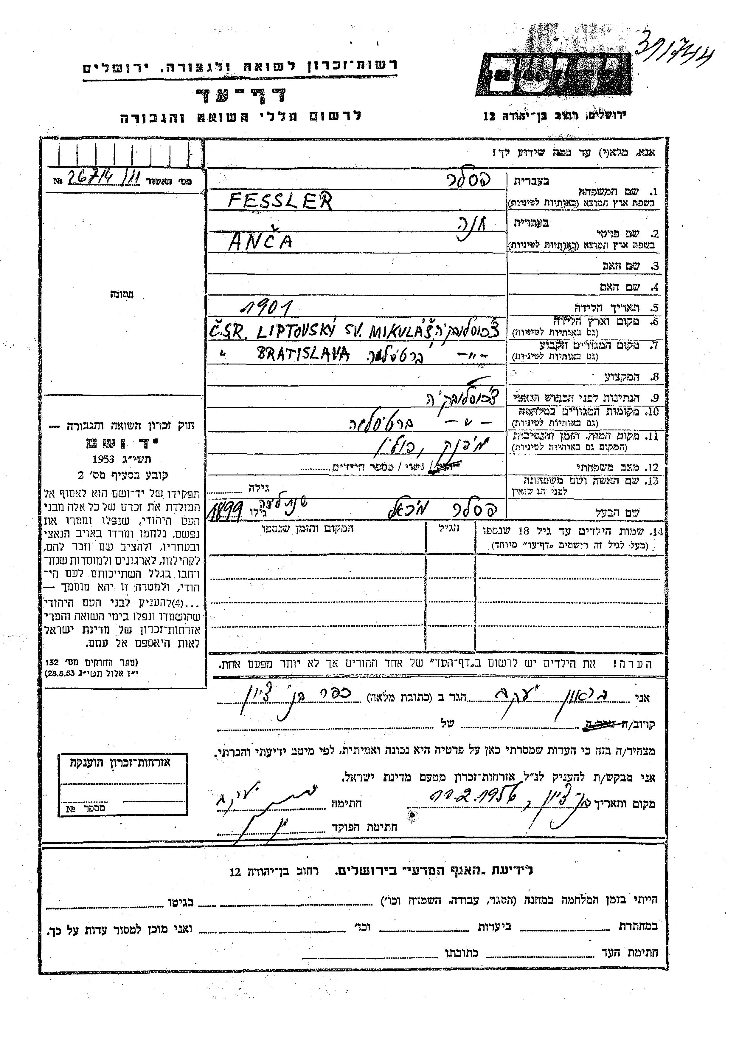 Анка Хана Фесслер, место рождения: Липтовский-Микулаш, Чехословакия. Женат / замужем. Место жительства до войны: Братислава, Чехословакия. Место во время войны: Братислава, Чехословакия.
