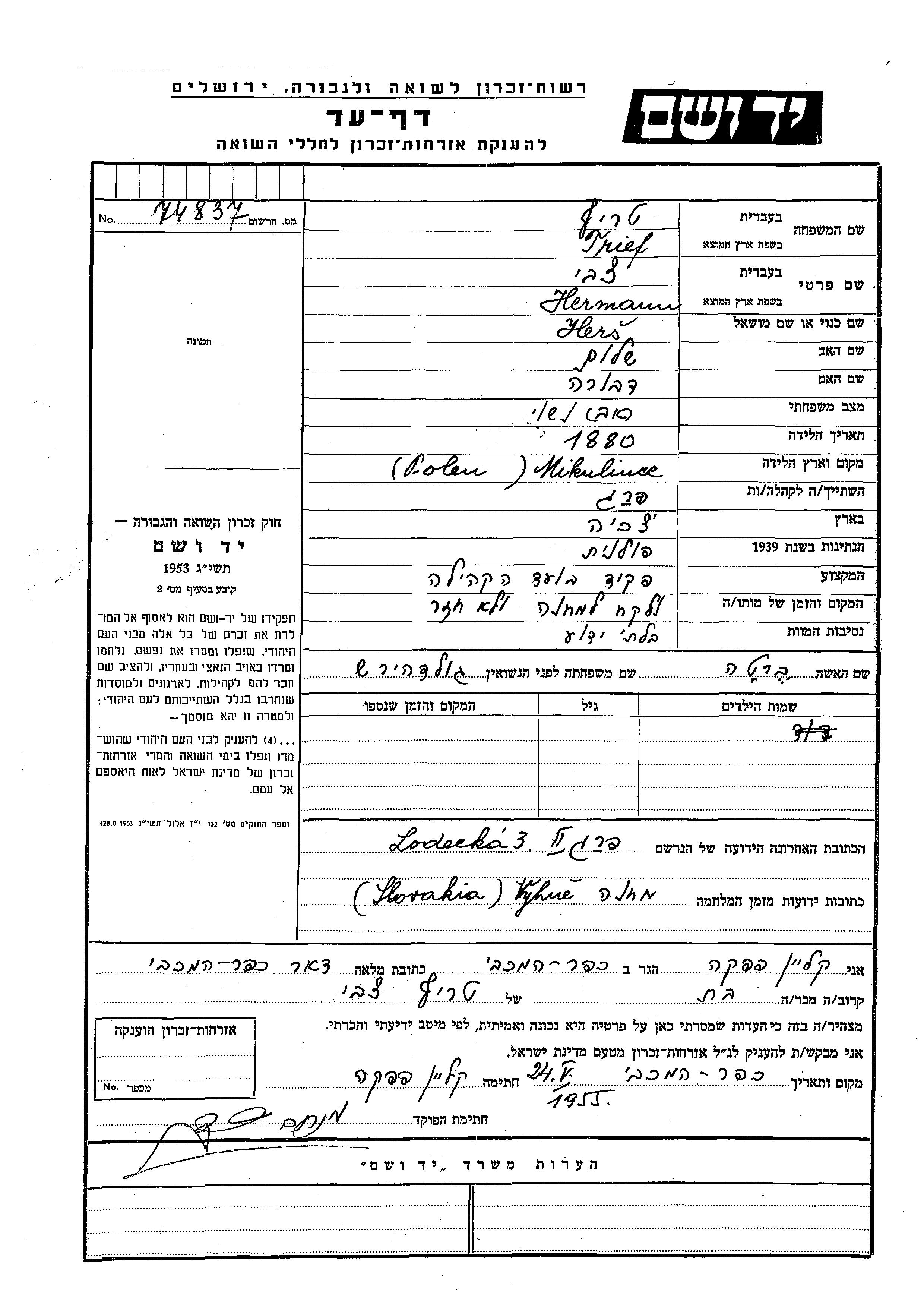 Триф Херман Цви 1880 Чехословакия Лист свидетельских показаний