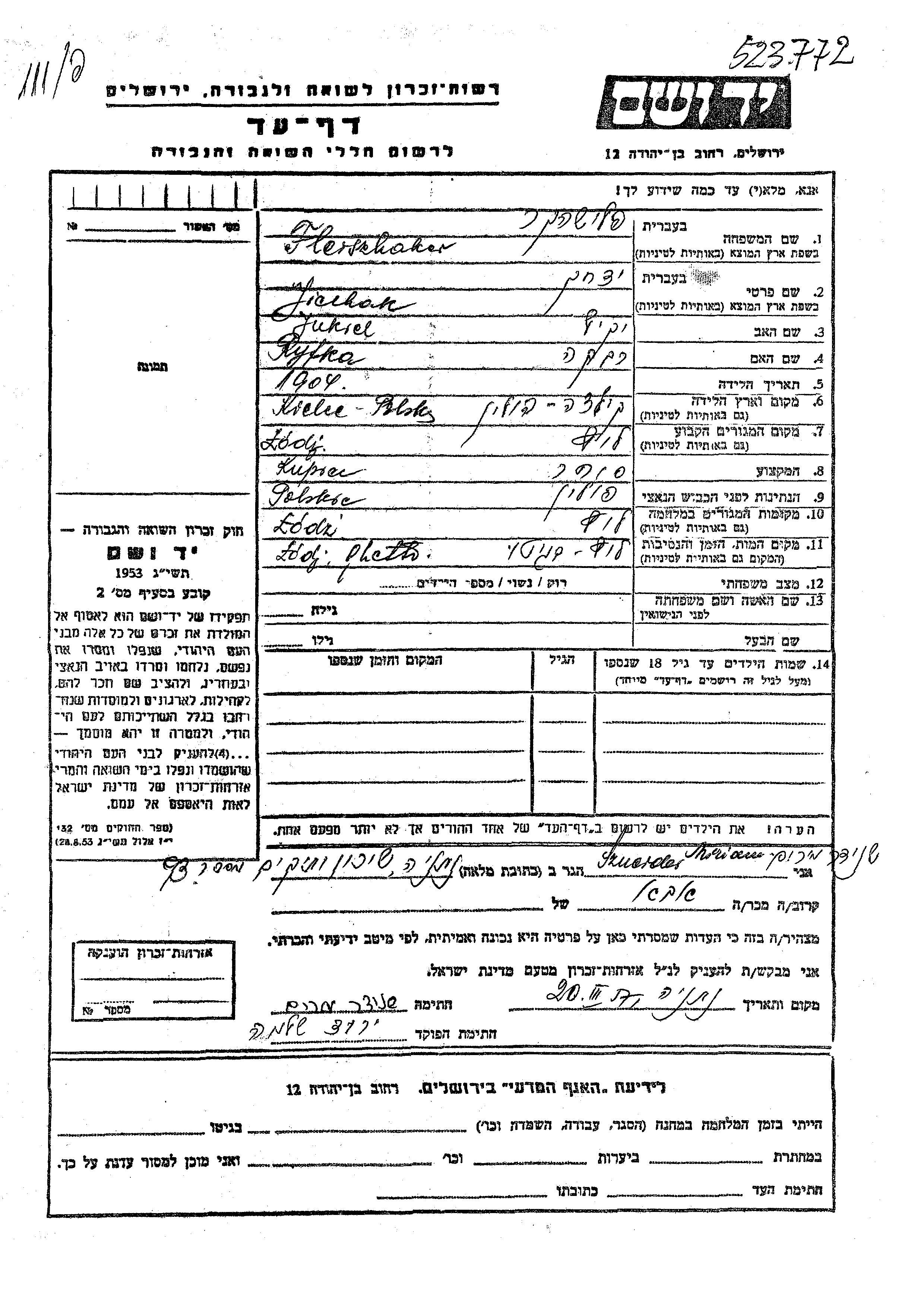 Флейшхакер Ицхак 1904 Лодзь, Польша Лист свидетельских показаний