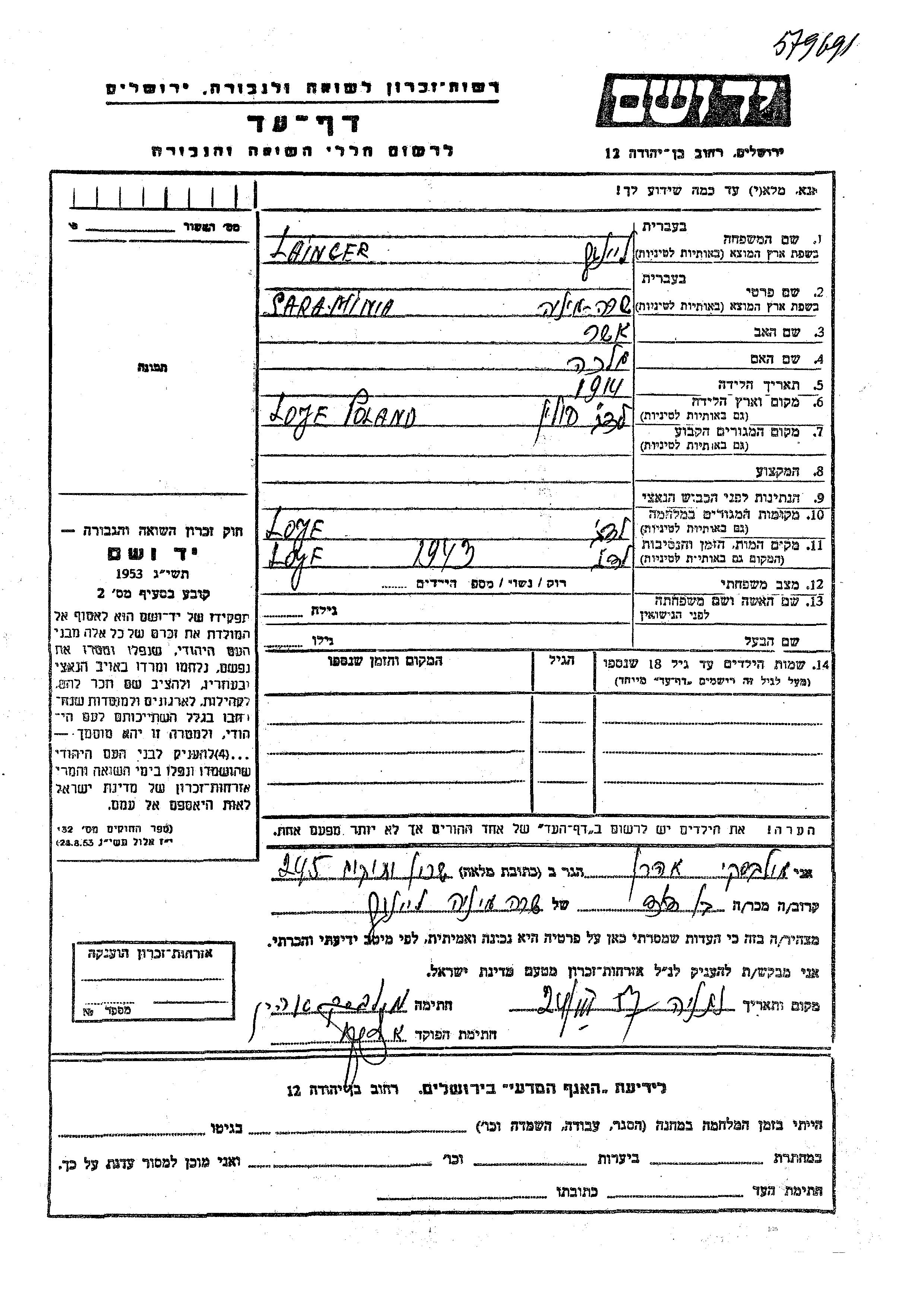 Миня Сара Лайнгер, место рождения: Лодзь, Польша. Отец: Ашер, mать:Малка. Холост / не замужем. Место во время войны: Лодзь, Польша.