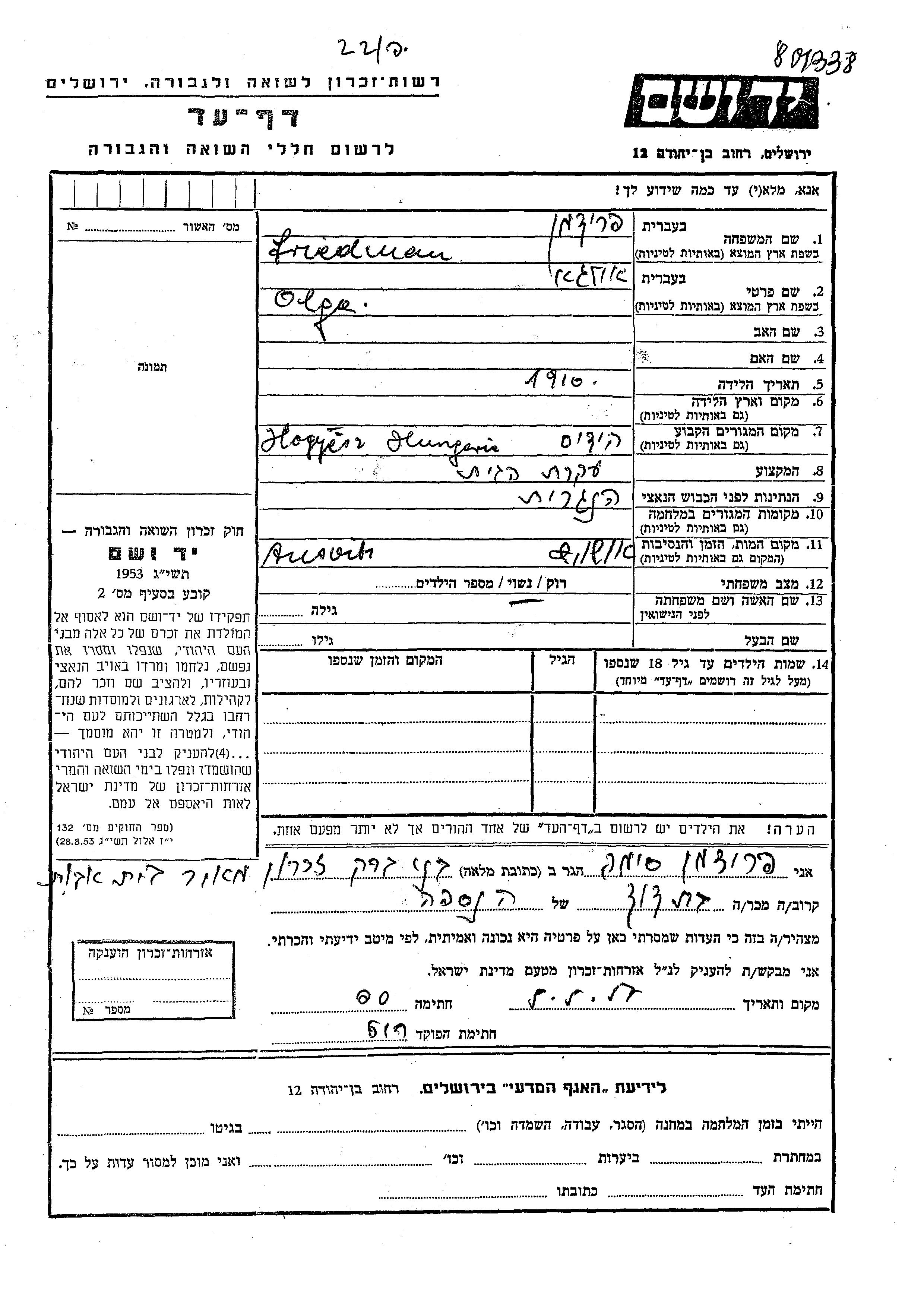 Фридман Ольга 1910 Ходас, Венгрия Лист свидетельских показаний