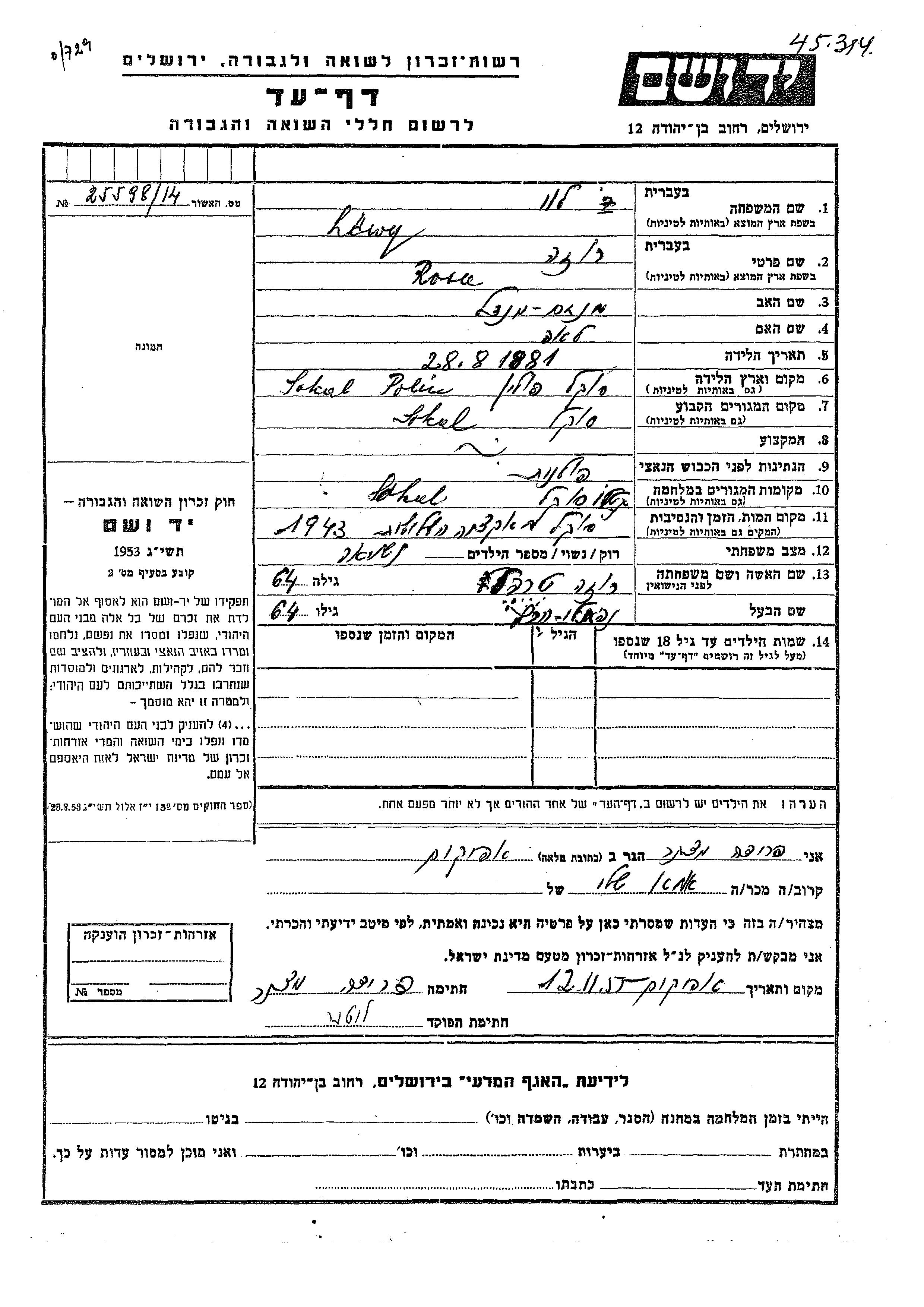 Яд Вашем - Листы свидетельских показаний Мемориального фонда