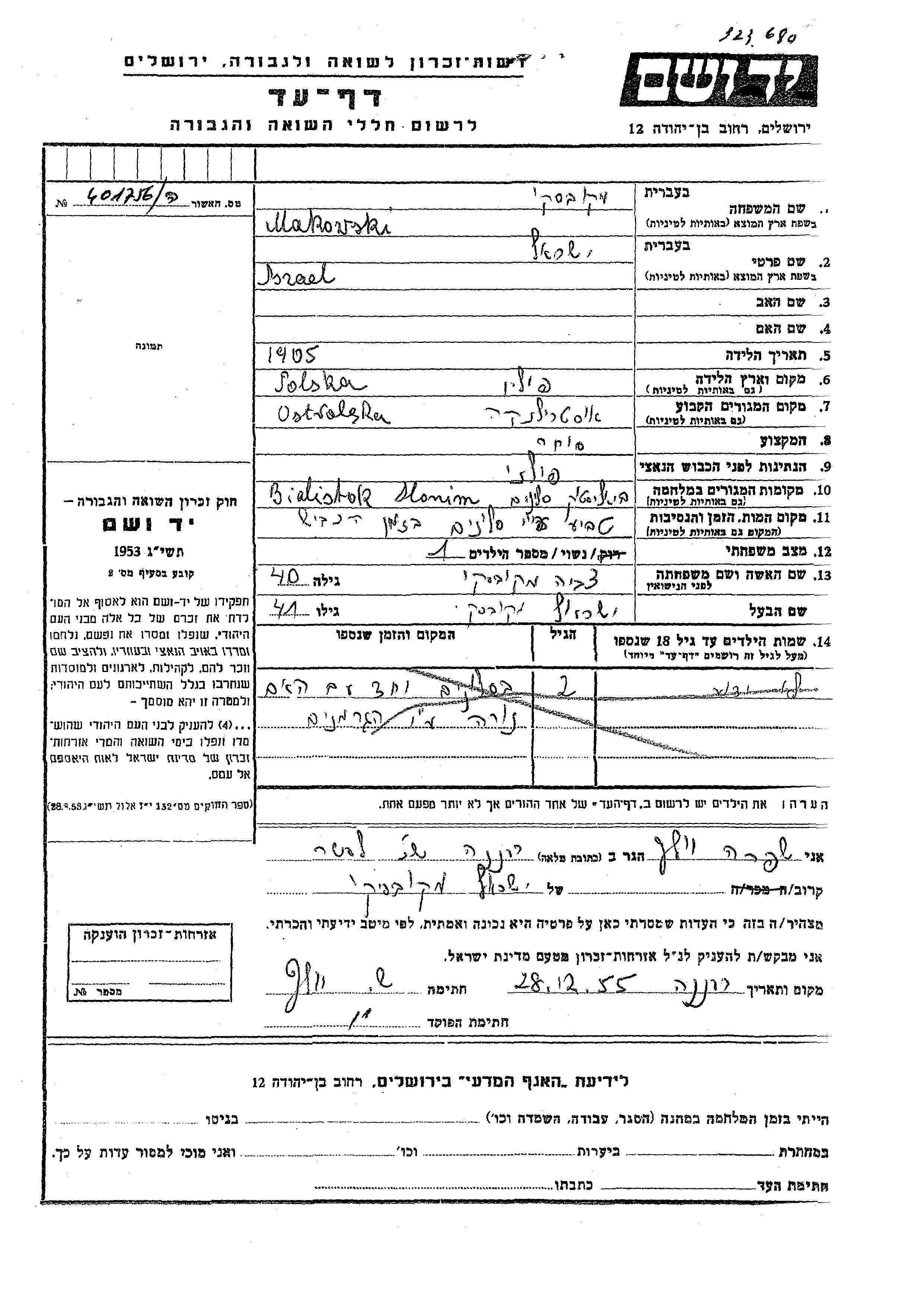 Маковски Исраэль 1905 Остроленка, Польша Лист свидетельских показаний
