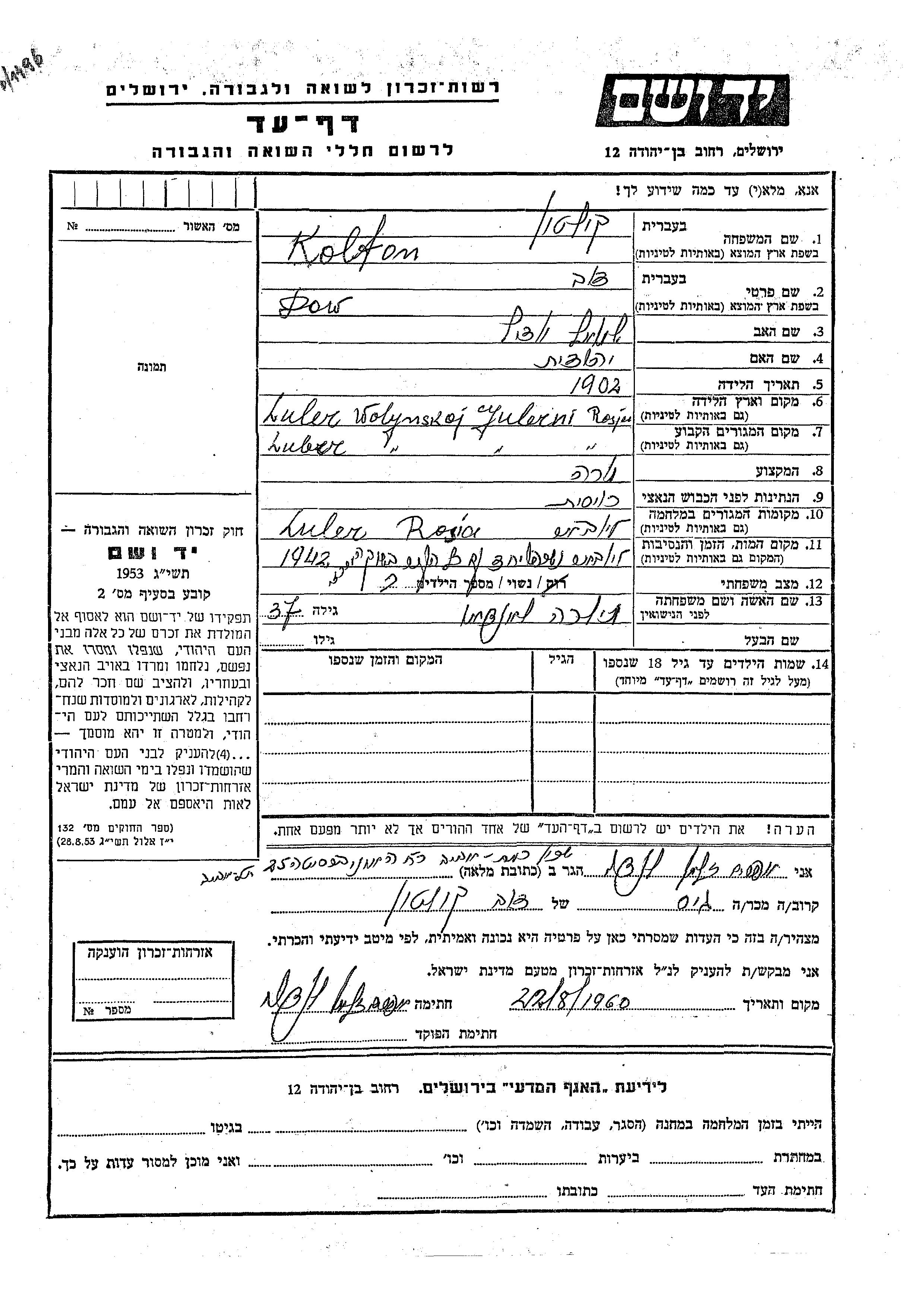 Дов Кольтон, место рождения: Любер, Украина (СССР). Отец: Шмуэль Юдиль, mать:Иегудит. Учитель / учительница. Женат / замужем. Место жительства до войны: Любер, Украина (СССР). Место во время войны: Любер, Украина (СССР).