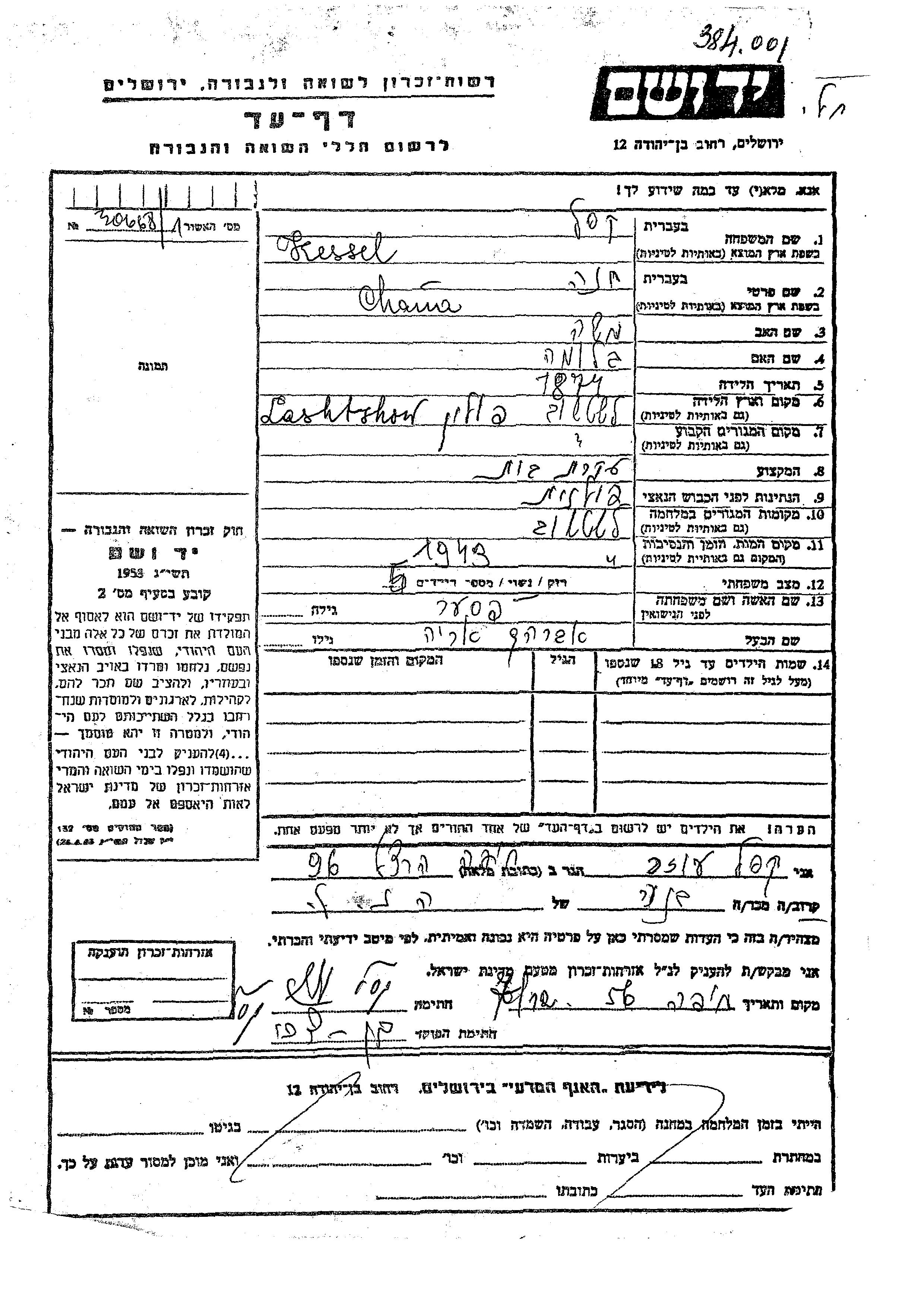 Хана Кессель, девичья фамилия Пасер, место рождения: Лащов, Польша. Отец: Моше, mать:Блюма. Домохозяйка. Женат / замужем. Место жительства до войны: Лащов, Польша. Место во время войны: Лащов, Польша.