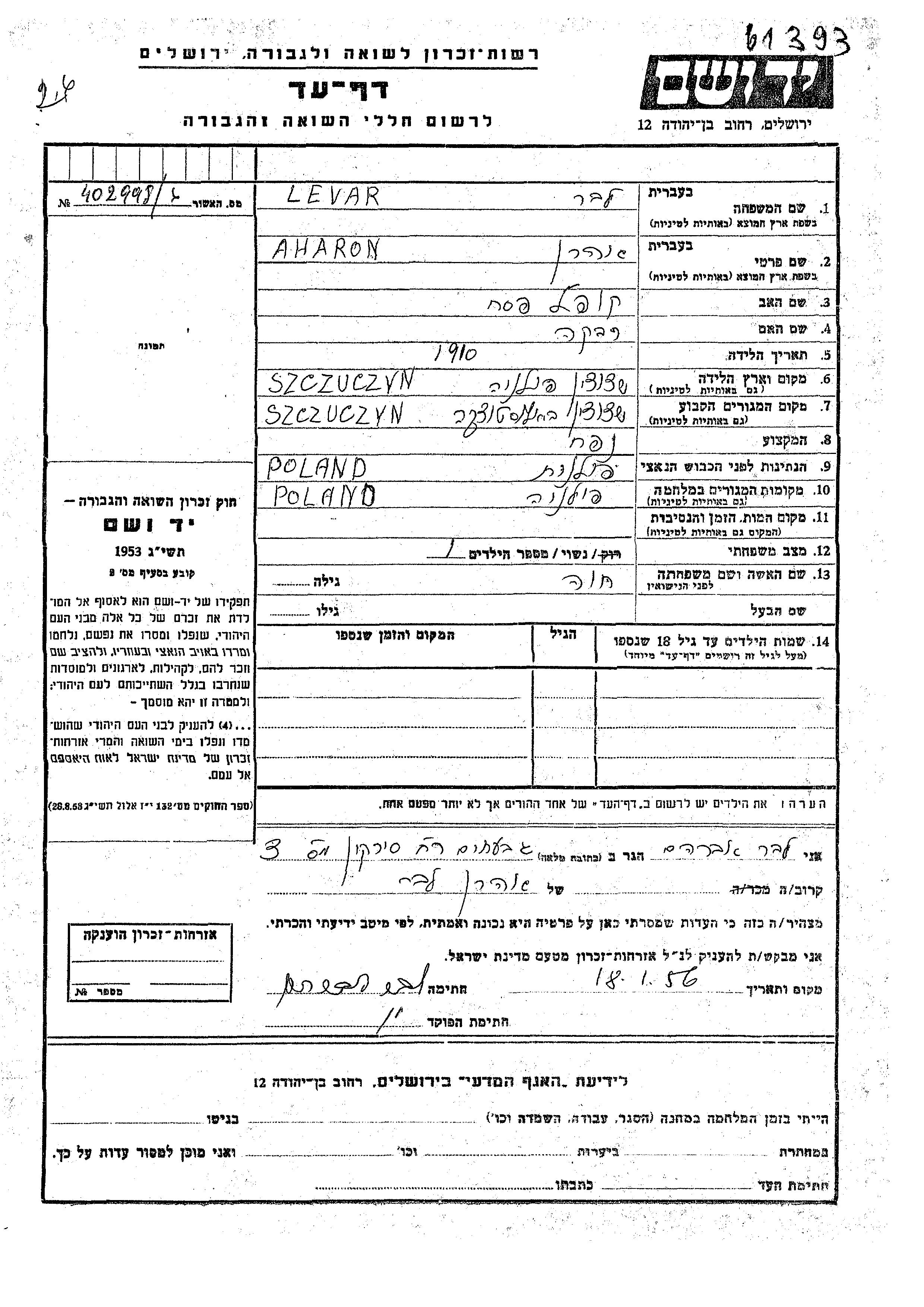 Левар Лабер Арон 1910 Щучин, Польша Лист свидетельских показаний