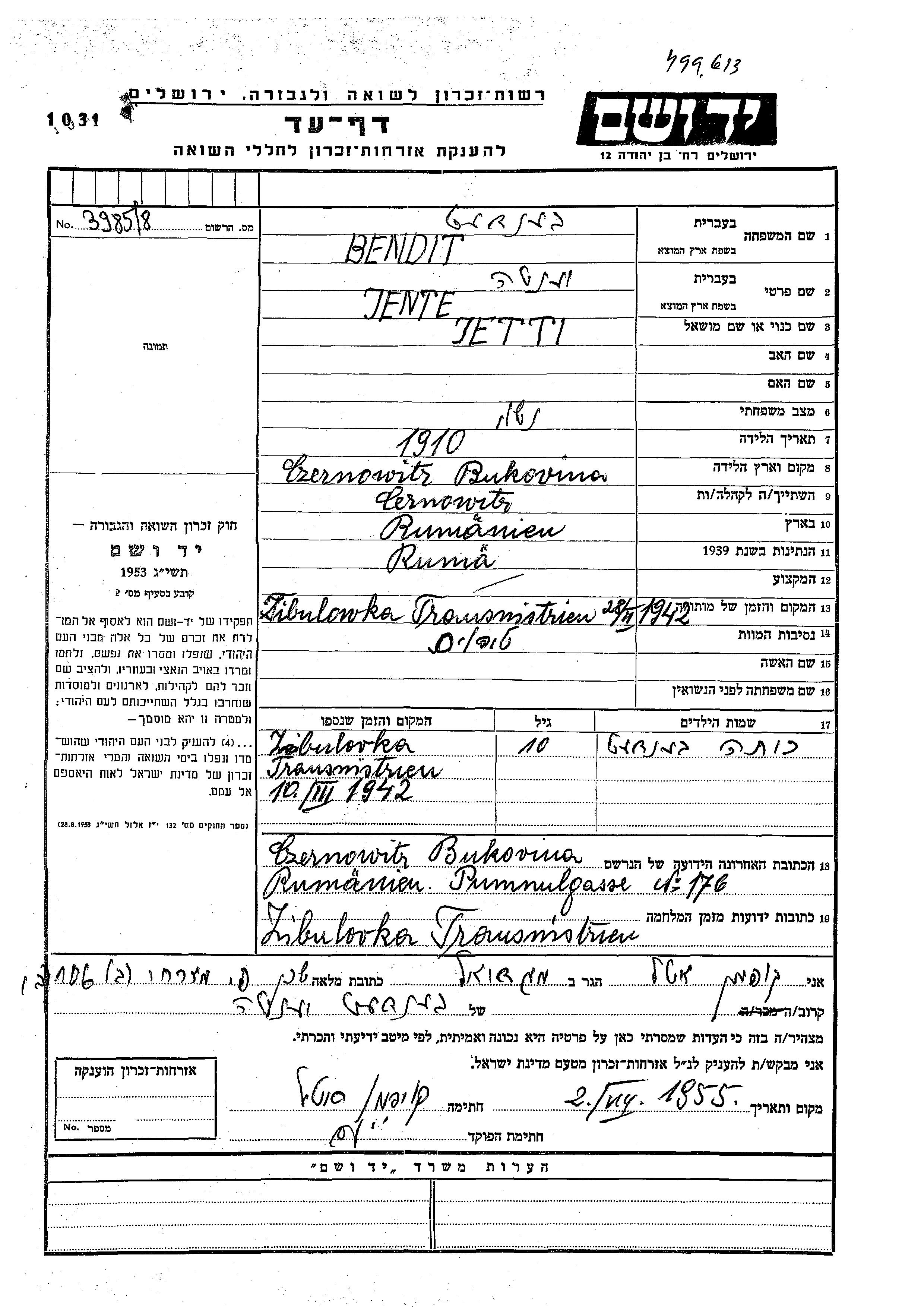 Енте Бендет, место рождения: Черновцы, Румыния. Женат / замужем. Место жительства до войны: Черновцы, Румыния. Место во время войны: Транснистрия, Украина (СССР).