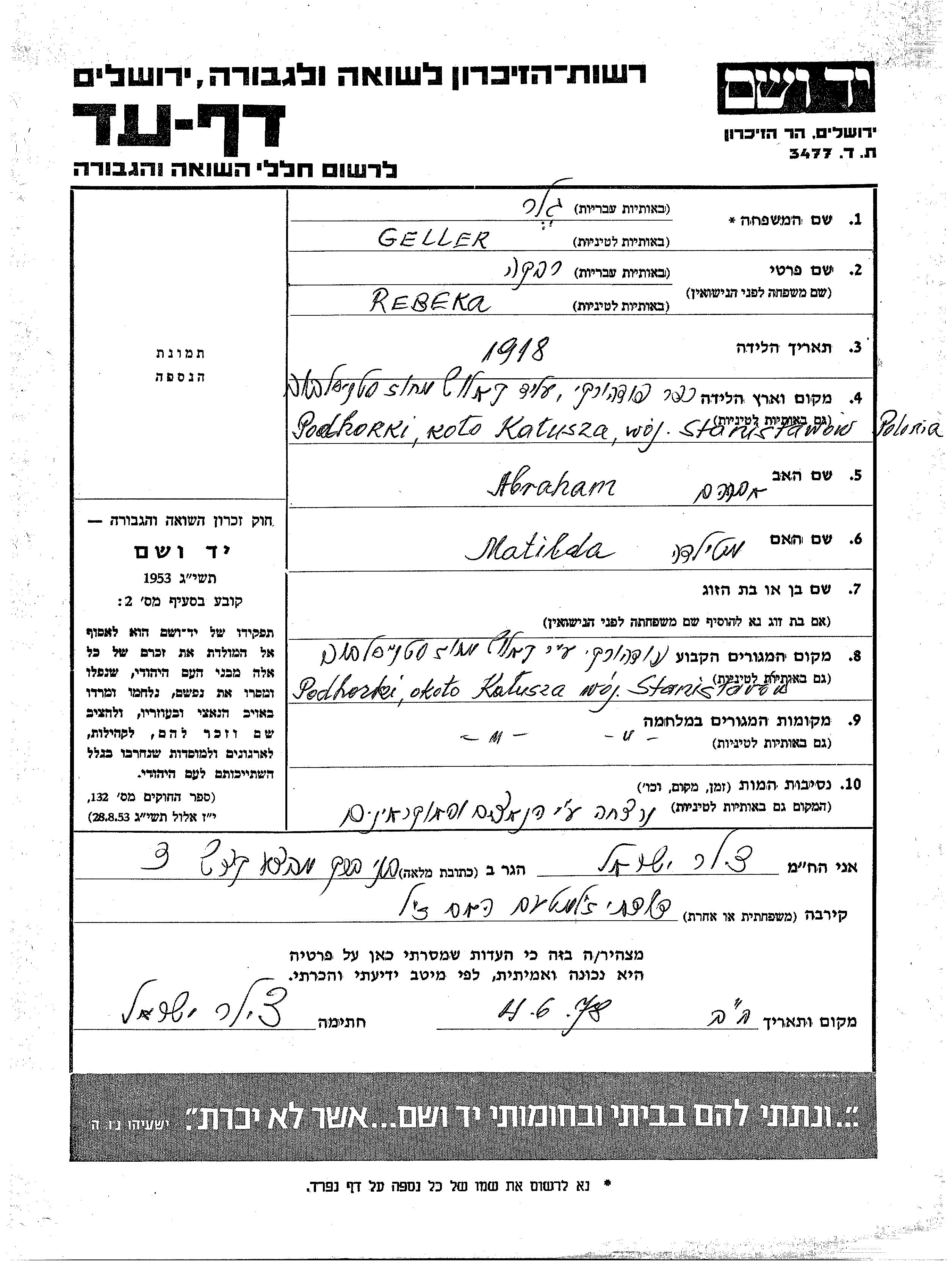 Ребека Геллер, место рождения: Подгорки, Польша. Отец: Абраам, mать:Матильда. Холост / не замужем. Место жительства до войны: Подгорки, Польша. Место во время войны: Подгорки, Польша.