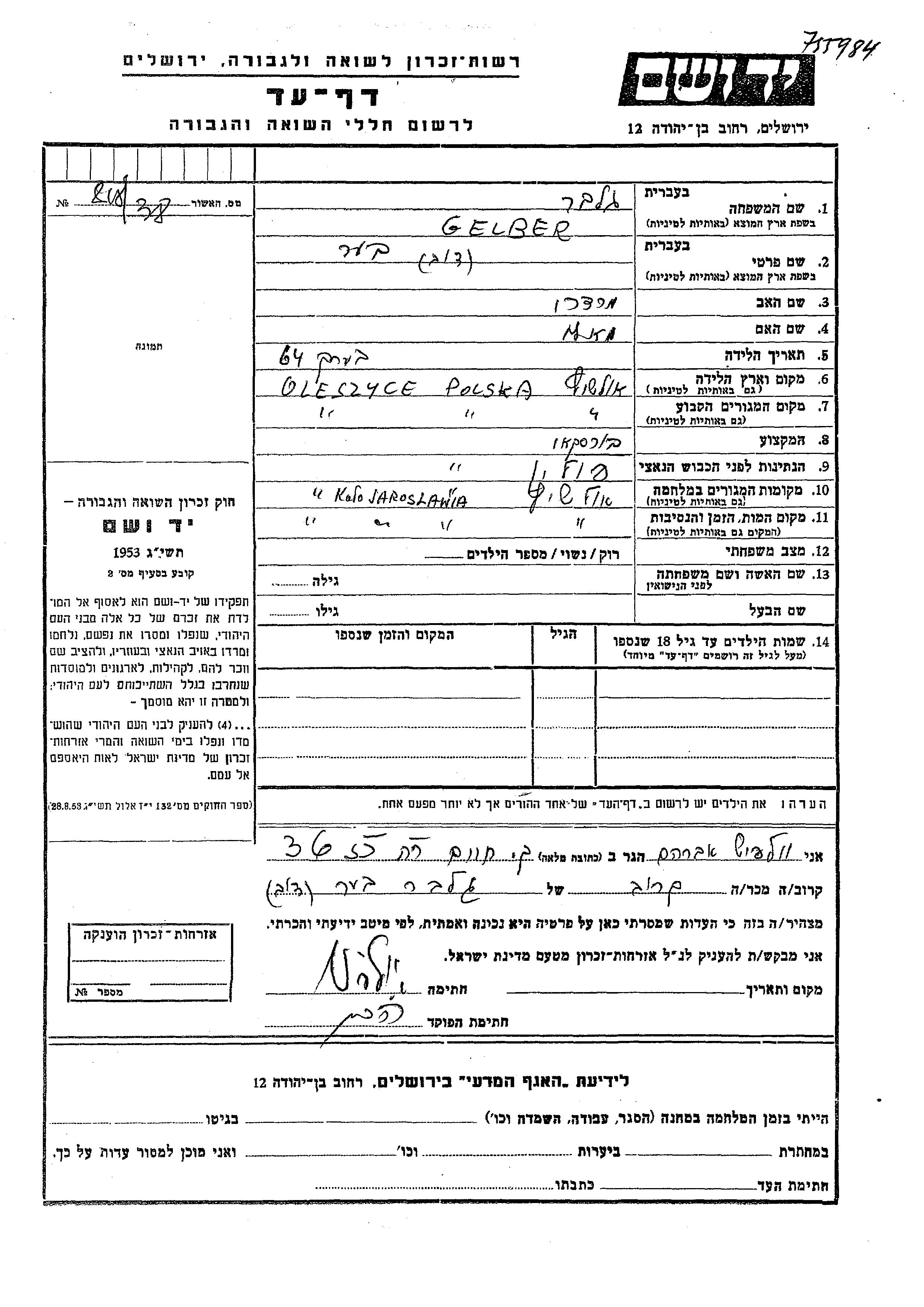 Бер Дов Гельбер, место рождения: Олешице, Польша. Отец: Мордехай, mать:Мали. Кожевник. Место жительства до войны: Олешице, Польша. Место во время войны: Олешице, Польша.