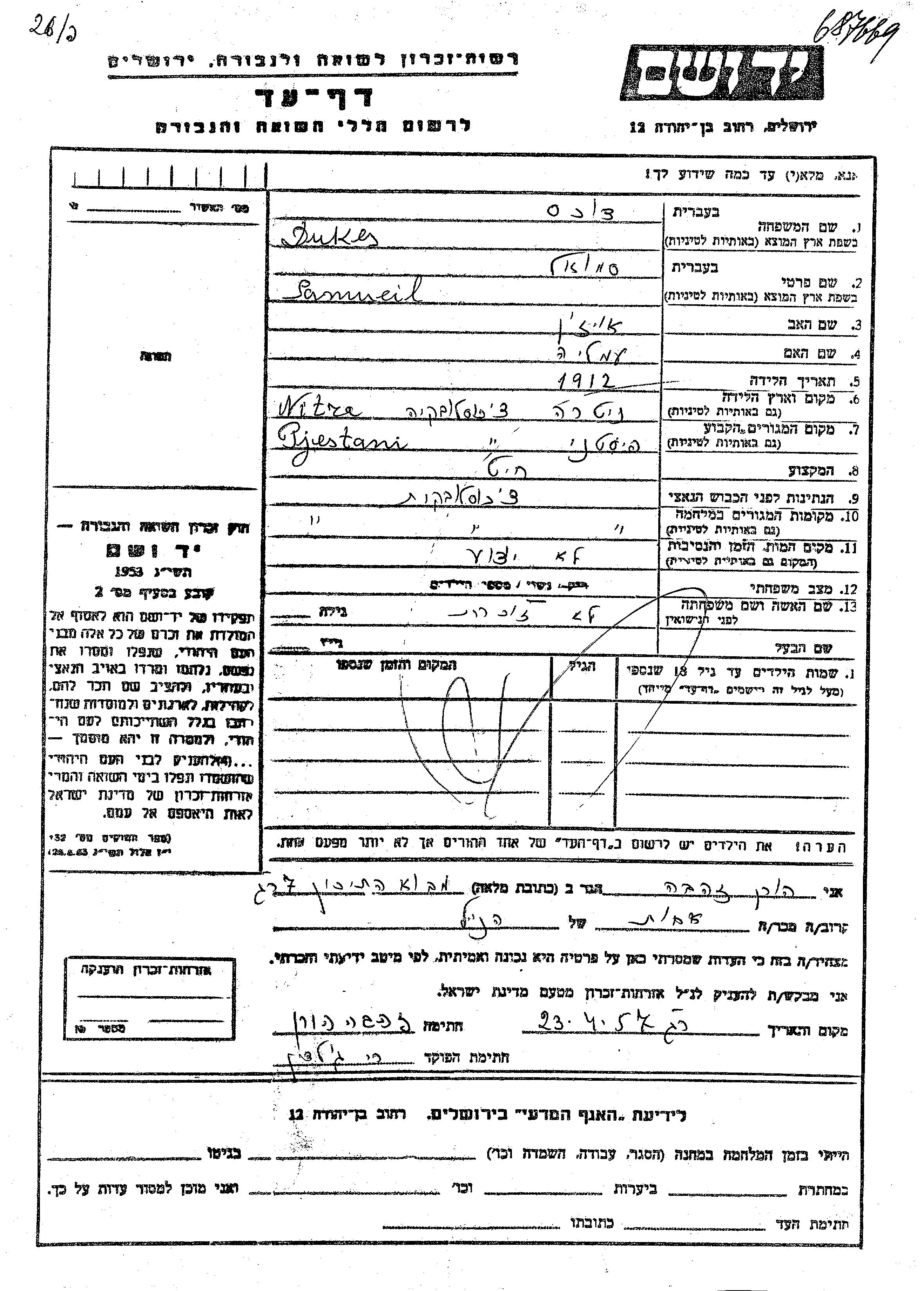 Дукес Шмуэль 1912 Пьештяны, Чехословакия Лист свидетельских показаний