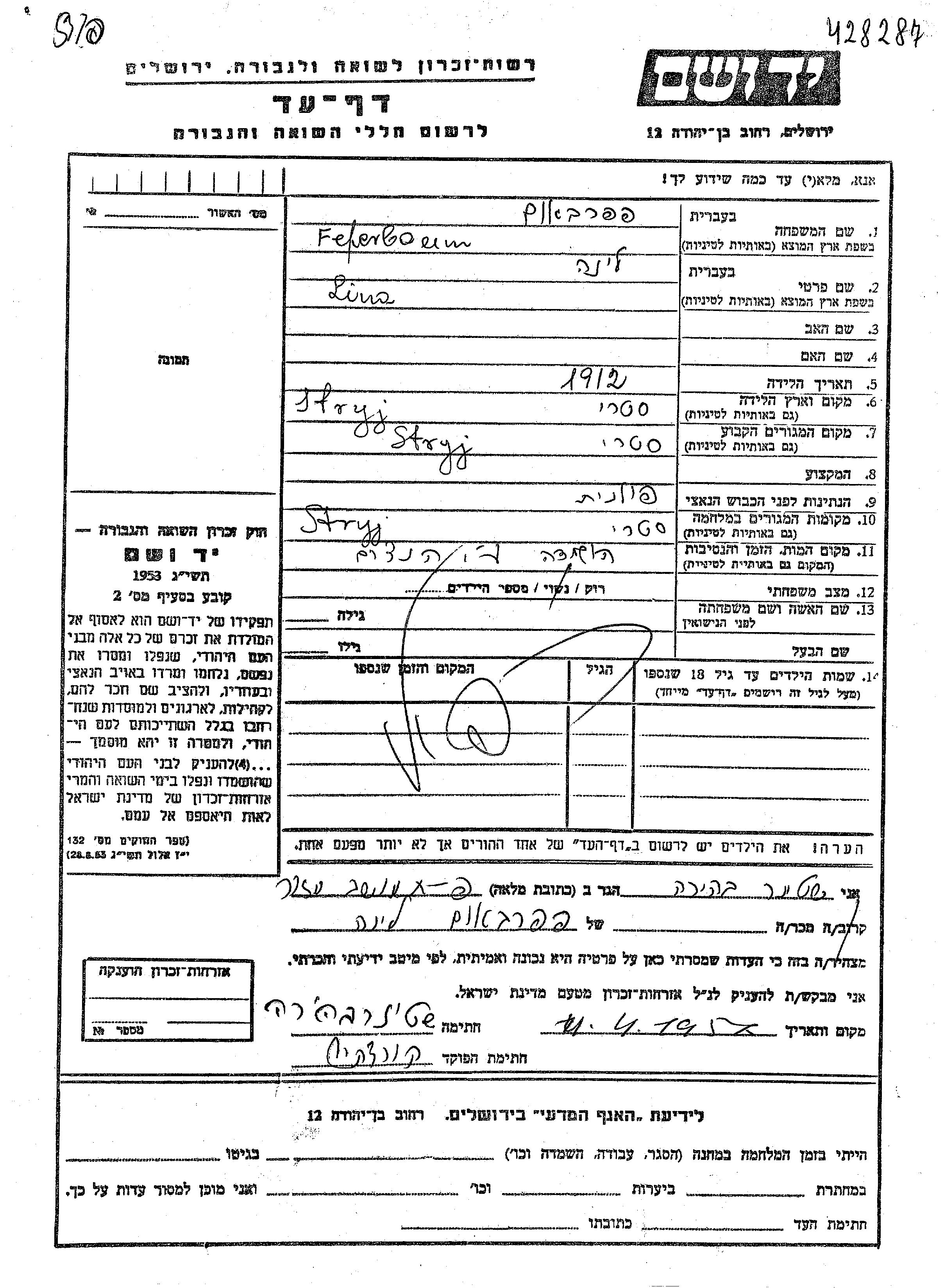 Лина Фепербаум, место рождения: Стрый, Польша. Холост / не замужем. Место жительства до войны: Стрый, Польша. Место во время войны: Стрый, Польша.