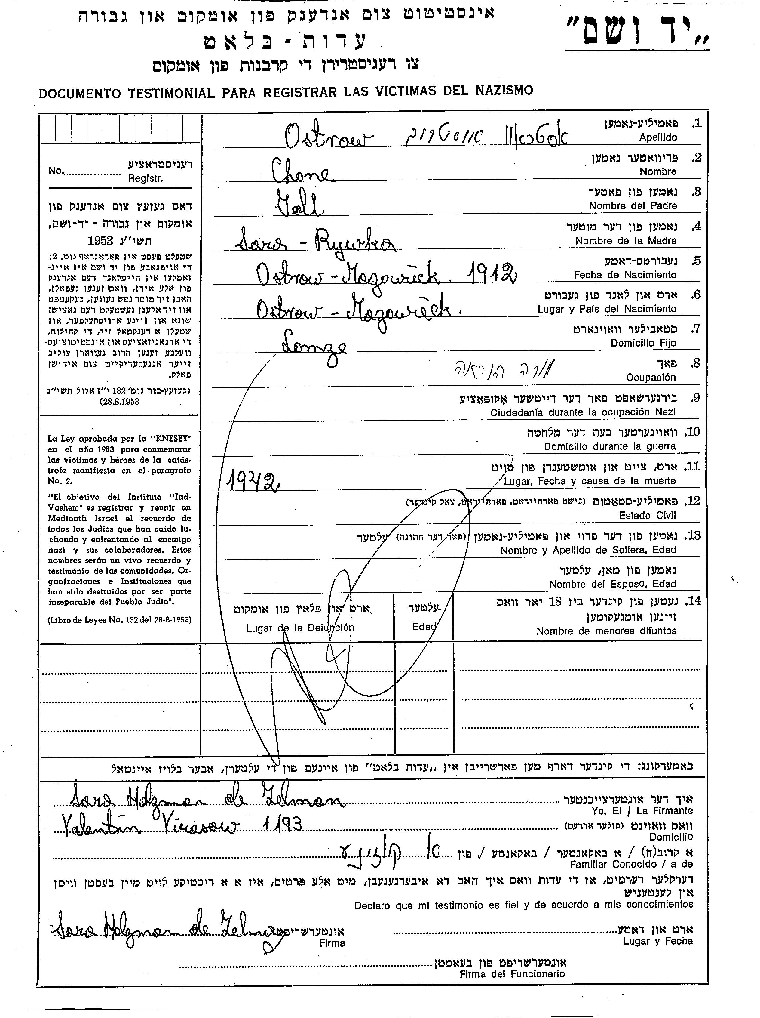 Хоне Остров, место рождения: Острув-Мазовецка, Польша. Отец: Yoll, mать:Сара Рывка. Учитель / учительница. Место жительства до войны: Ломжа, Польша.