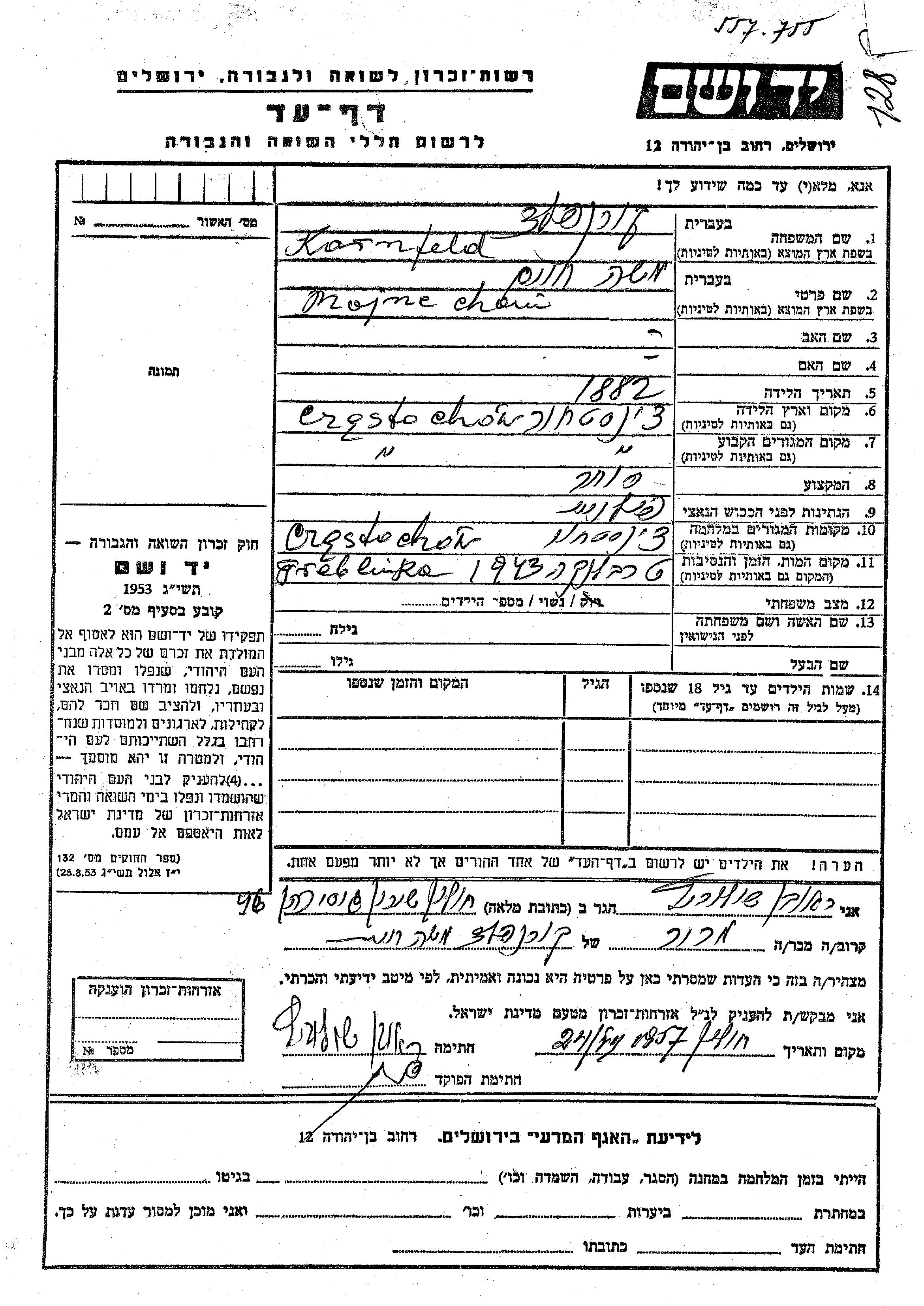 Мойше Хаим Корнфельд, место рождения: Честохов, Польша. Торговец / торговка. Женат / замужем. Место жительства до войны: Честохов, Польша. Место во время войны: Честохов, Польша.