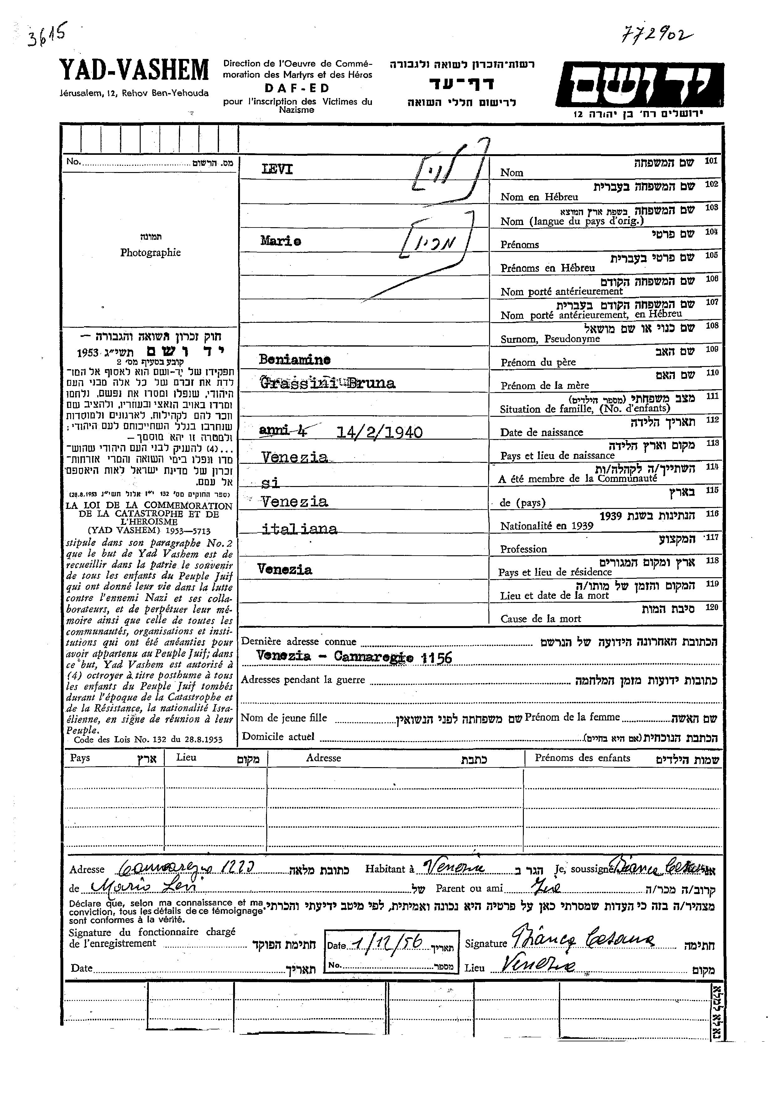 Марио Леви, место рождения: Венеция, Италия. Отец: Беньямино, mать:Бруна. Место жительства до войны: Венеция, Италия.