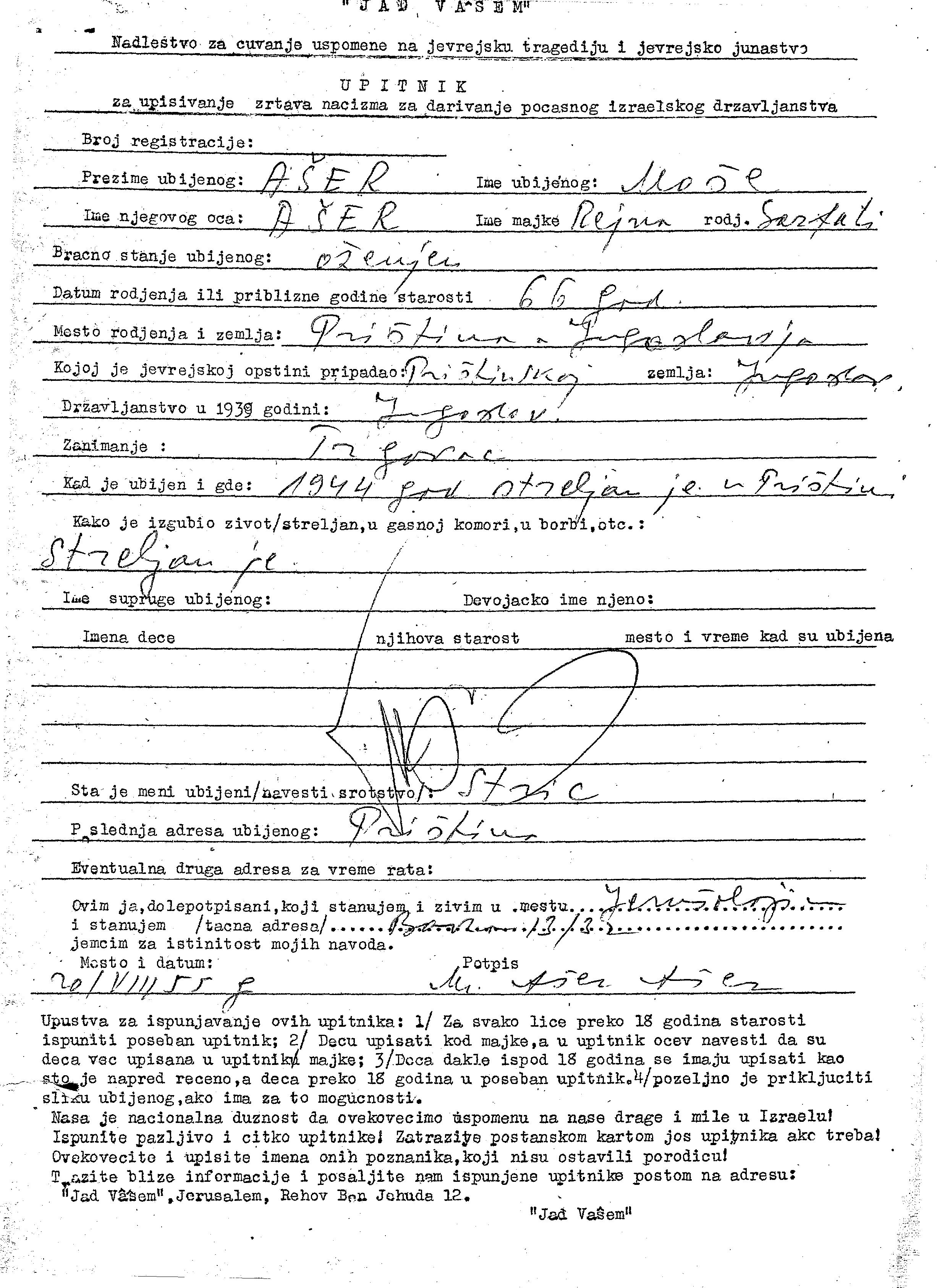 Моше Ашер, место рождения: Приштина, Югославия. Отец: Ашер, mать:Рейси. Торговец / торговка. Женат / замужем. Место жительства до войны: Приштина, Югославия. Место во время войны: Приштина, Югославия.