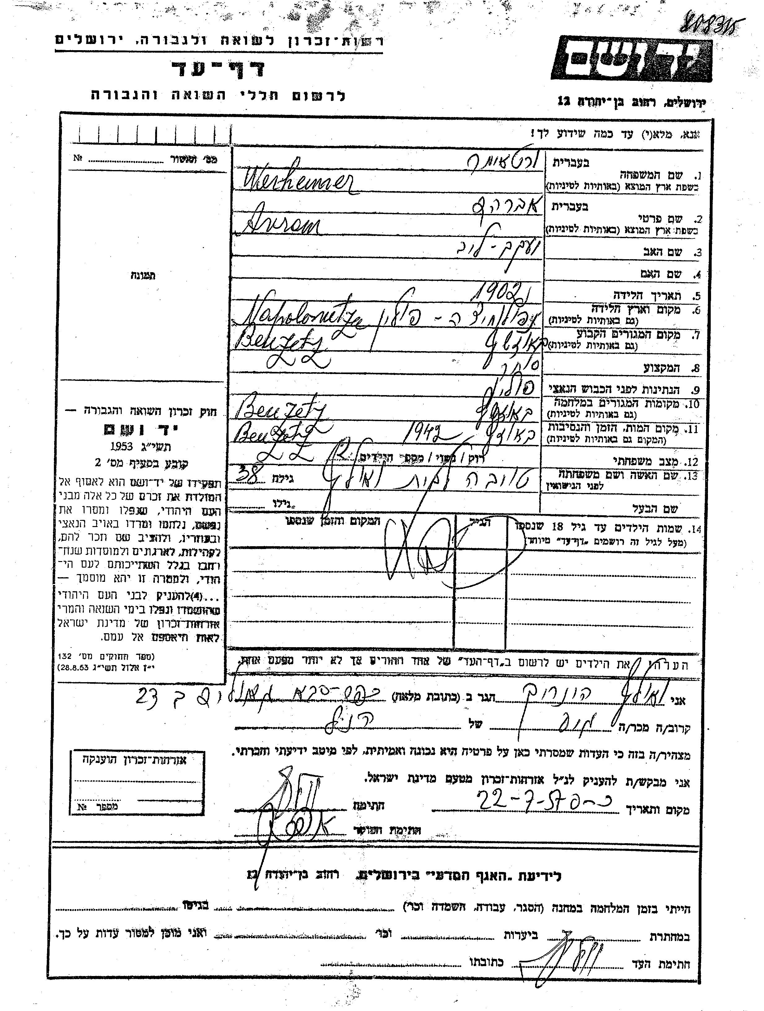 Яд Вашем - Листы свидетельских показаний Мемориального фонда