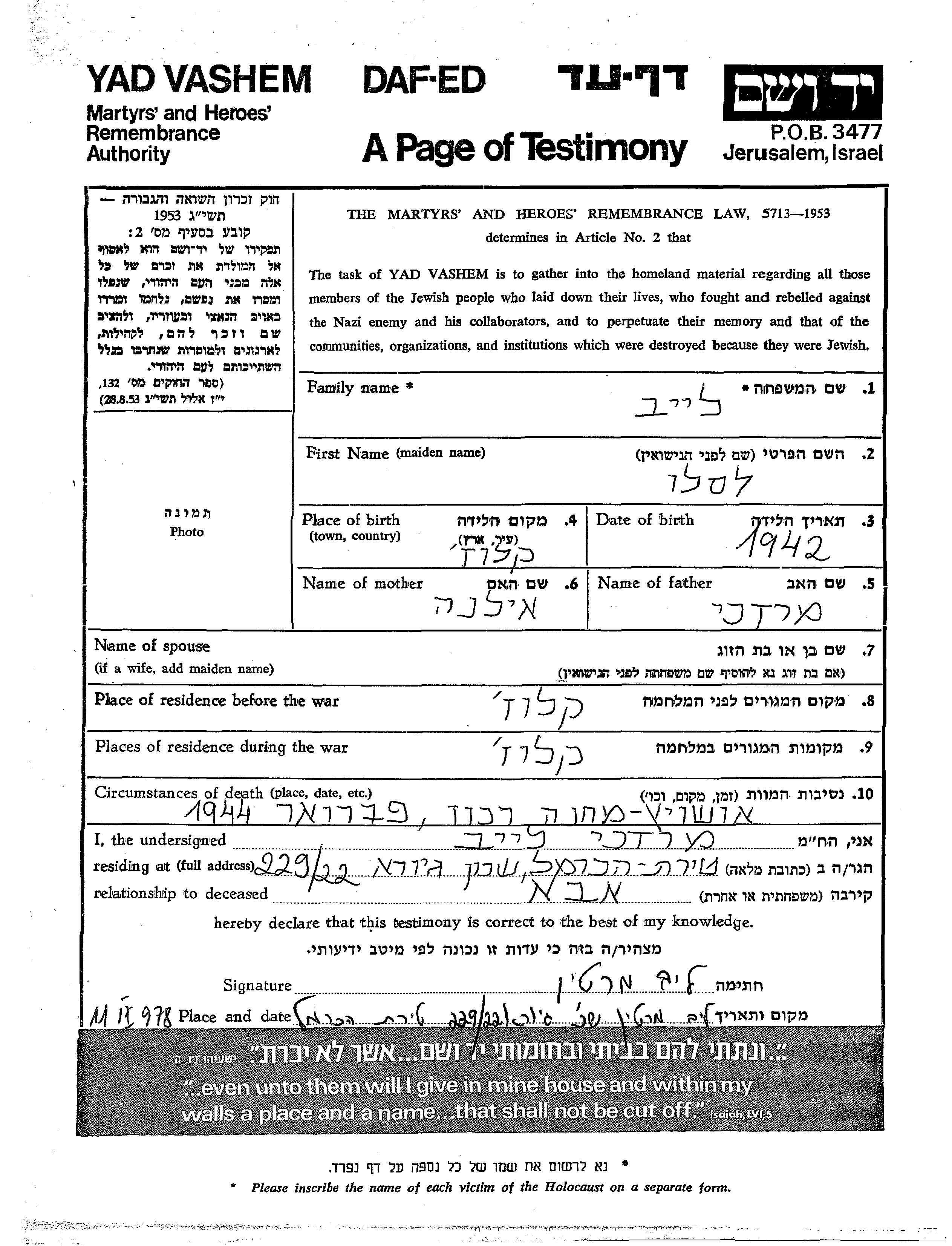 Лейб Ласло 1942 Клуж, Румыния Лист свидетельских показаний
