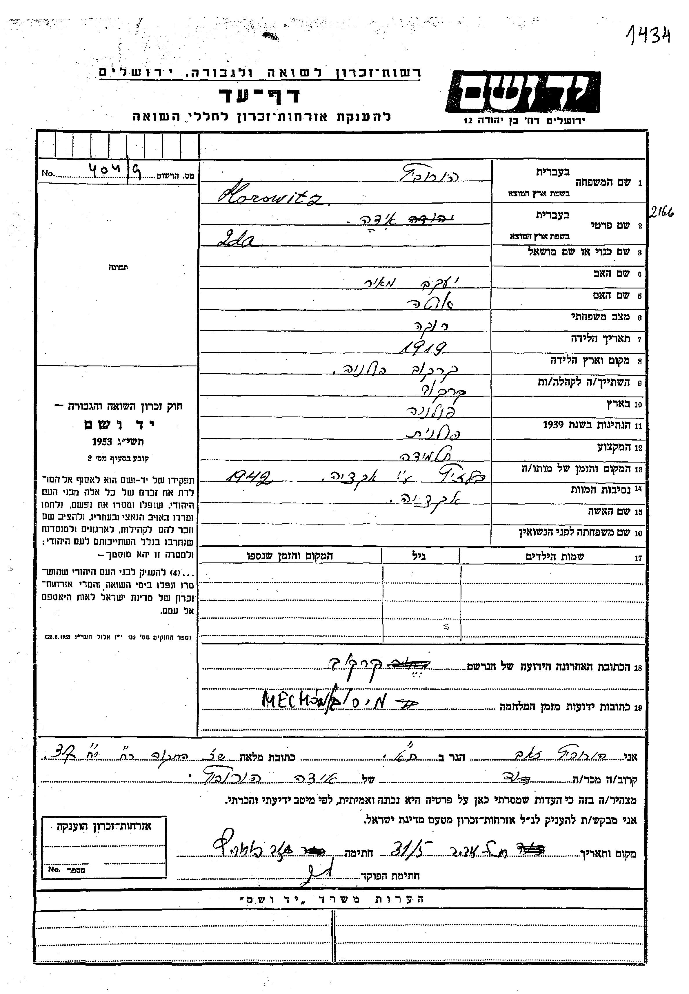 Ида Хоровиц, место рождения: Краков, Польша. Отец: Яков Меир, mать:Ита. Ученик / ученица. Холост / не замужем. Место жительства до войны: Краков, Польша. Место во время войны: Мехув, Польша.