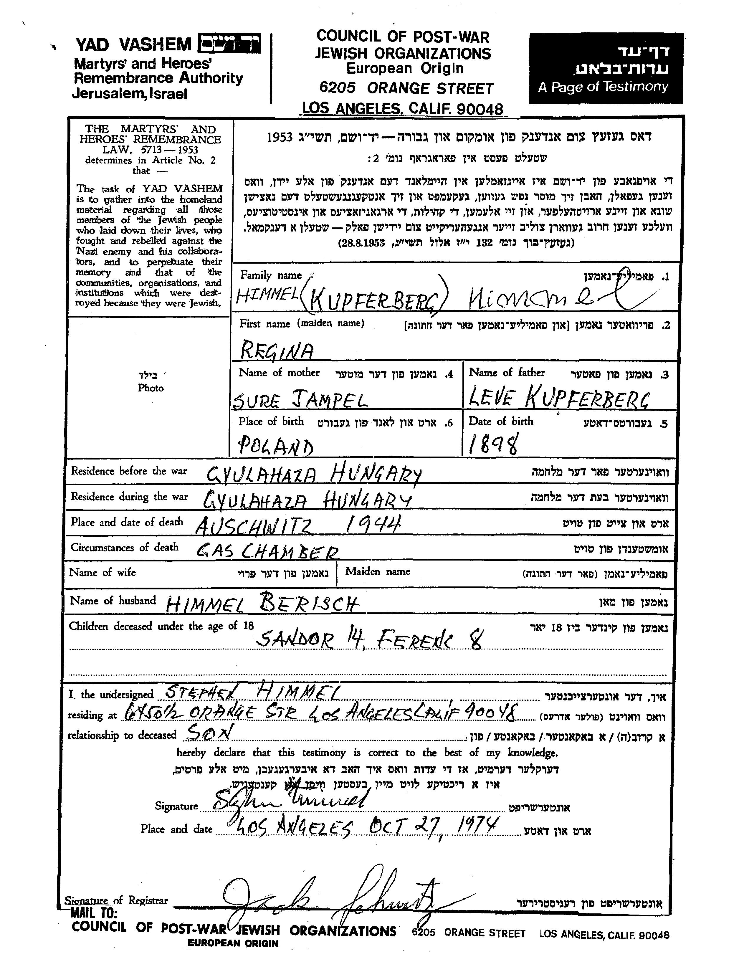 Регина Химмель, девичья фамилия Купферберг, место рождения: Польша. Отец: Лёва, mать:Суре. Женат / замужем. Место жительства до войны: Дьюлахаза, Венгрия. Место во время войны: Дьюлахаза, Венгрия.
