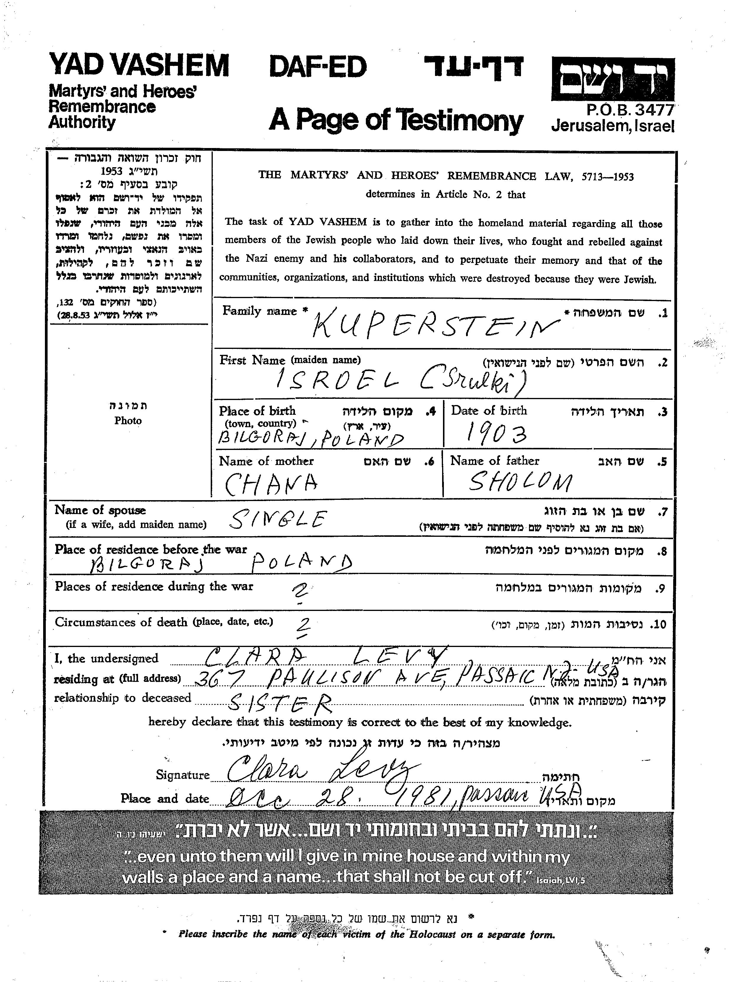 Куперштайн Исроэль 1903 место не указано, Лист свидетельских показаний