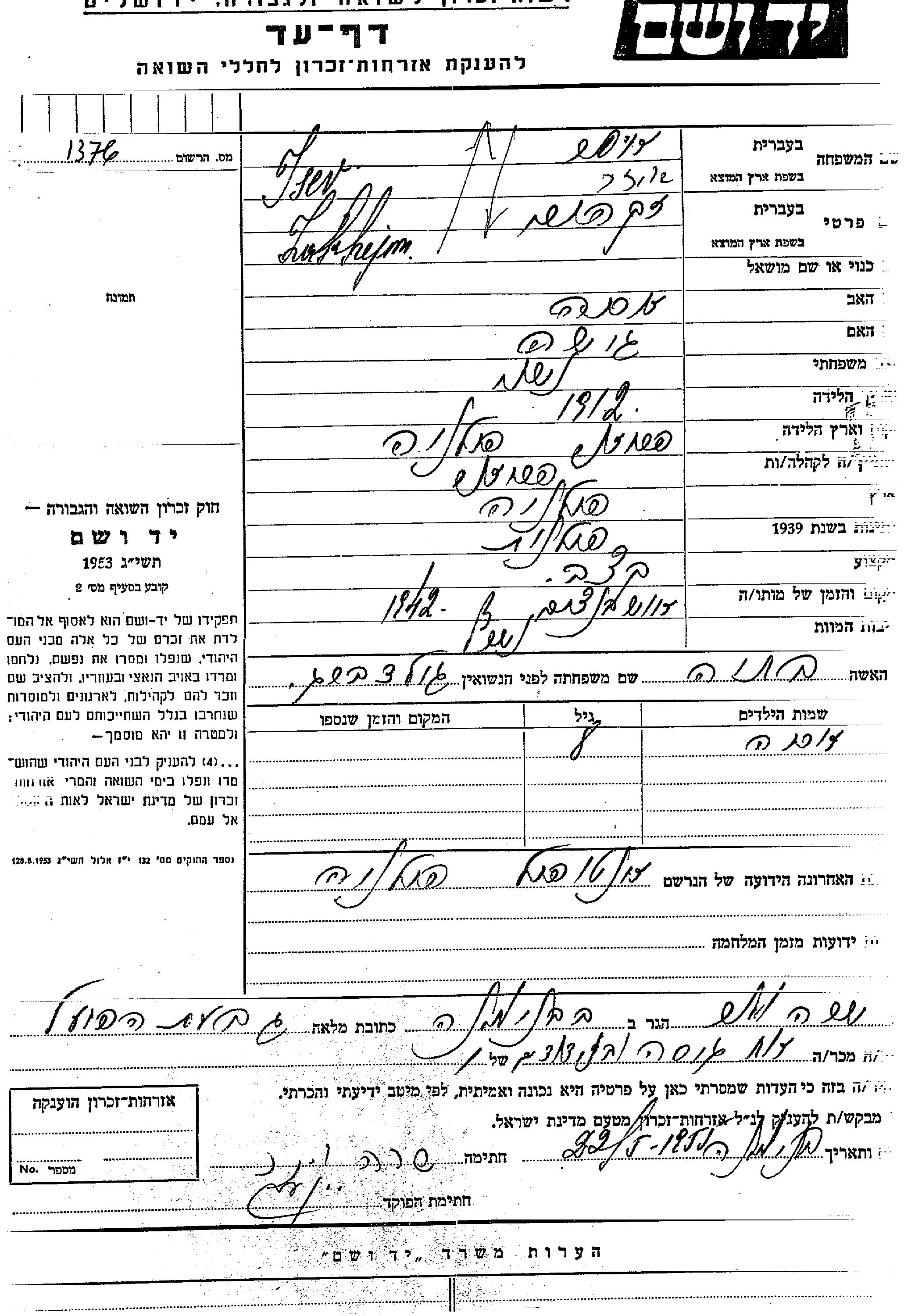 Изер Исер Закхайм, место рождения: Пружаны, Польша. Отец: Эрна, mать:Гиша. Мясник. Женат / замужем. Место жительства до войны: Антополь, Польша.