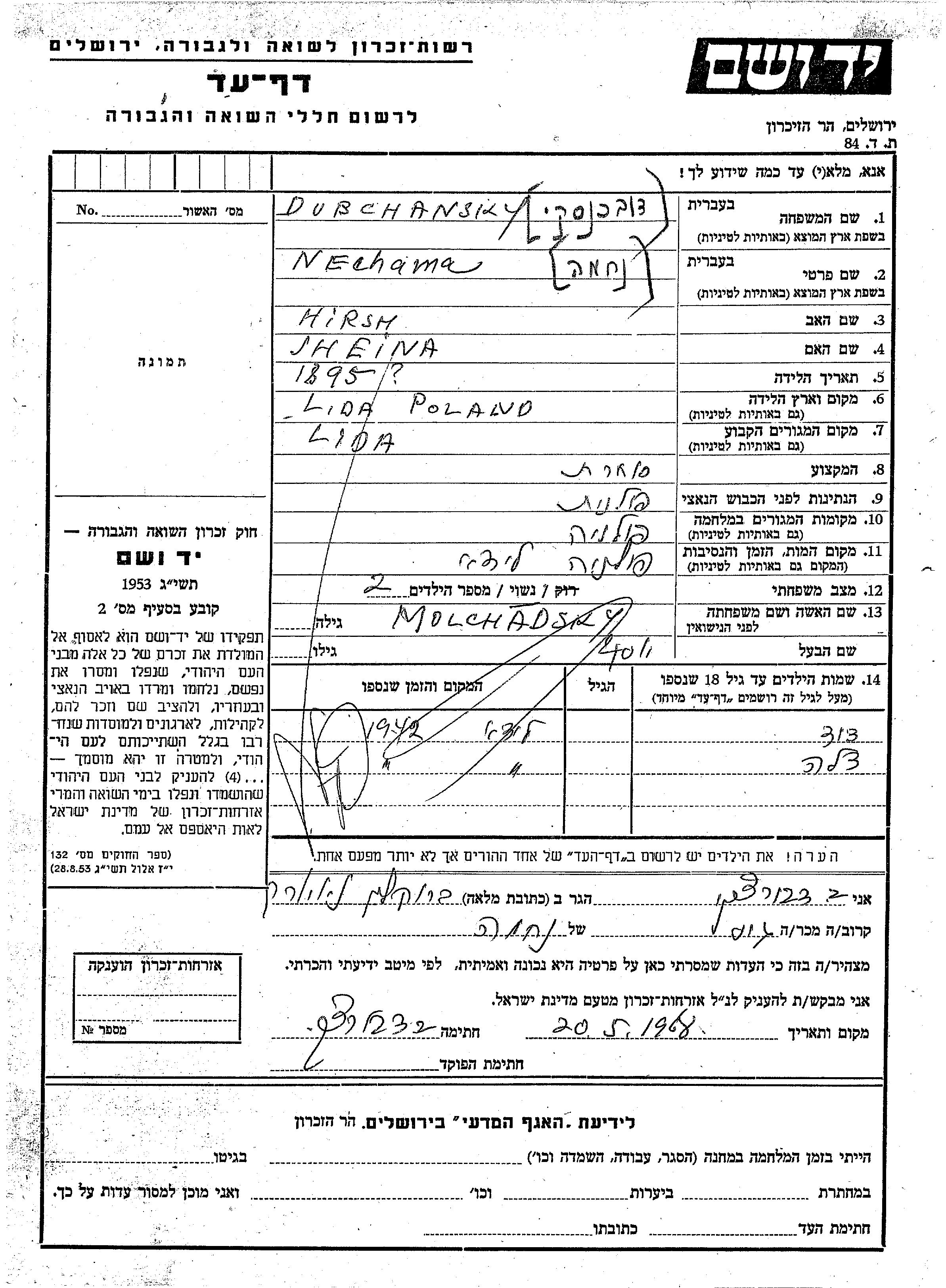 Нехама Дубчански Добхански, девичья фамилия Молчадский, место рождения: Лида, Польша. Отец: Хирш, mать:Шейва. Торговец / торговка. Женат / замужем. Место жительства до войны: Лида, Польша. Место во время войны: Польша.