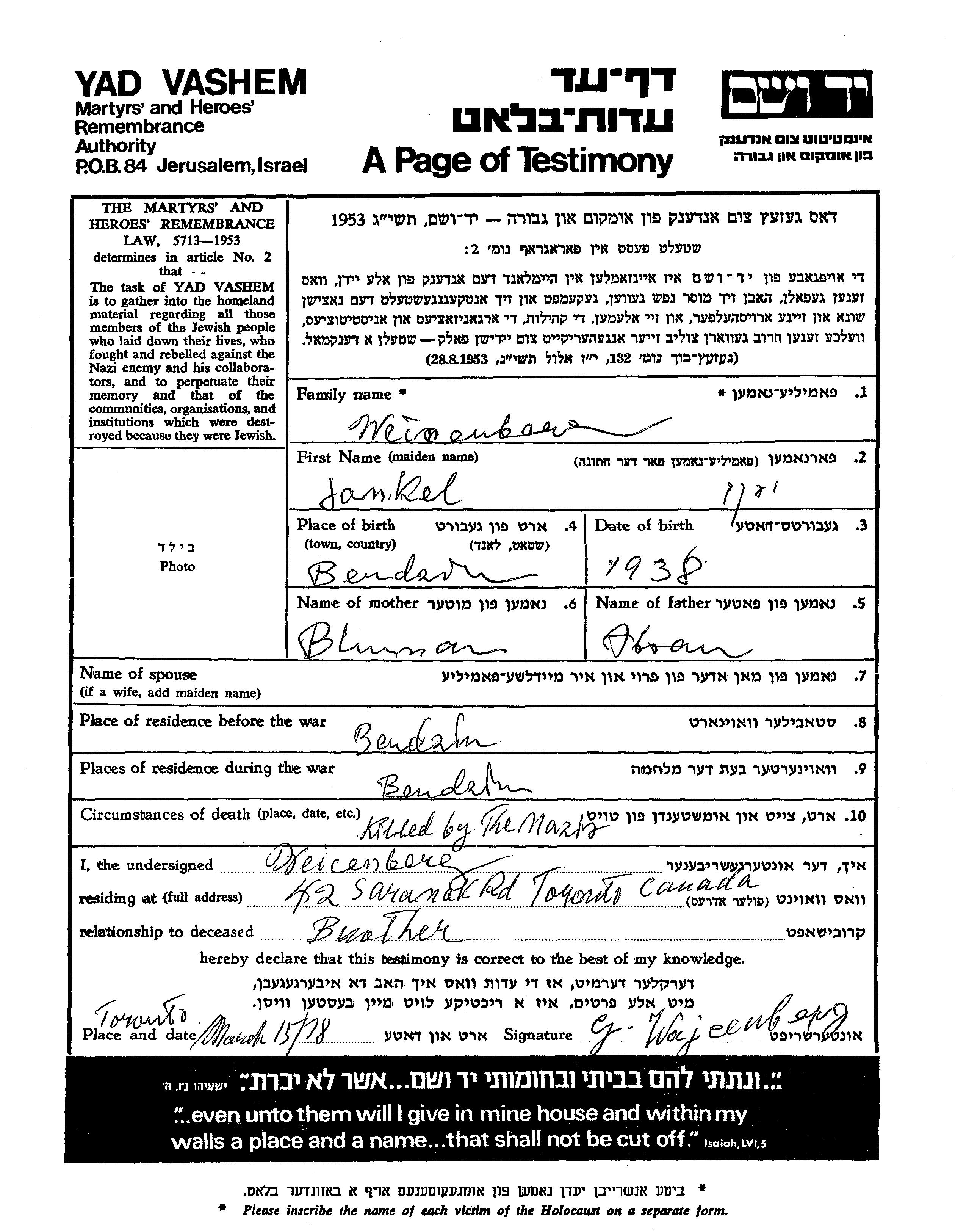 Янкель Вейценберг, место рождения: Бендзин, Польша. Отец: Абрам, mать:Блюма. Место жительства до войны: Бендзин, Польша. Место во время войны: Бендзин, Польша.