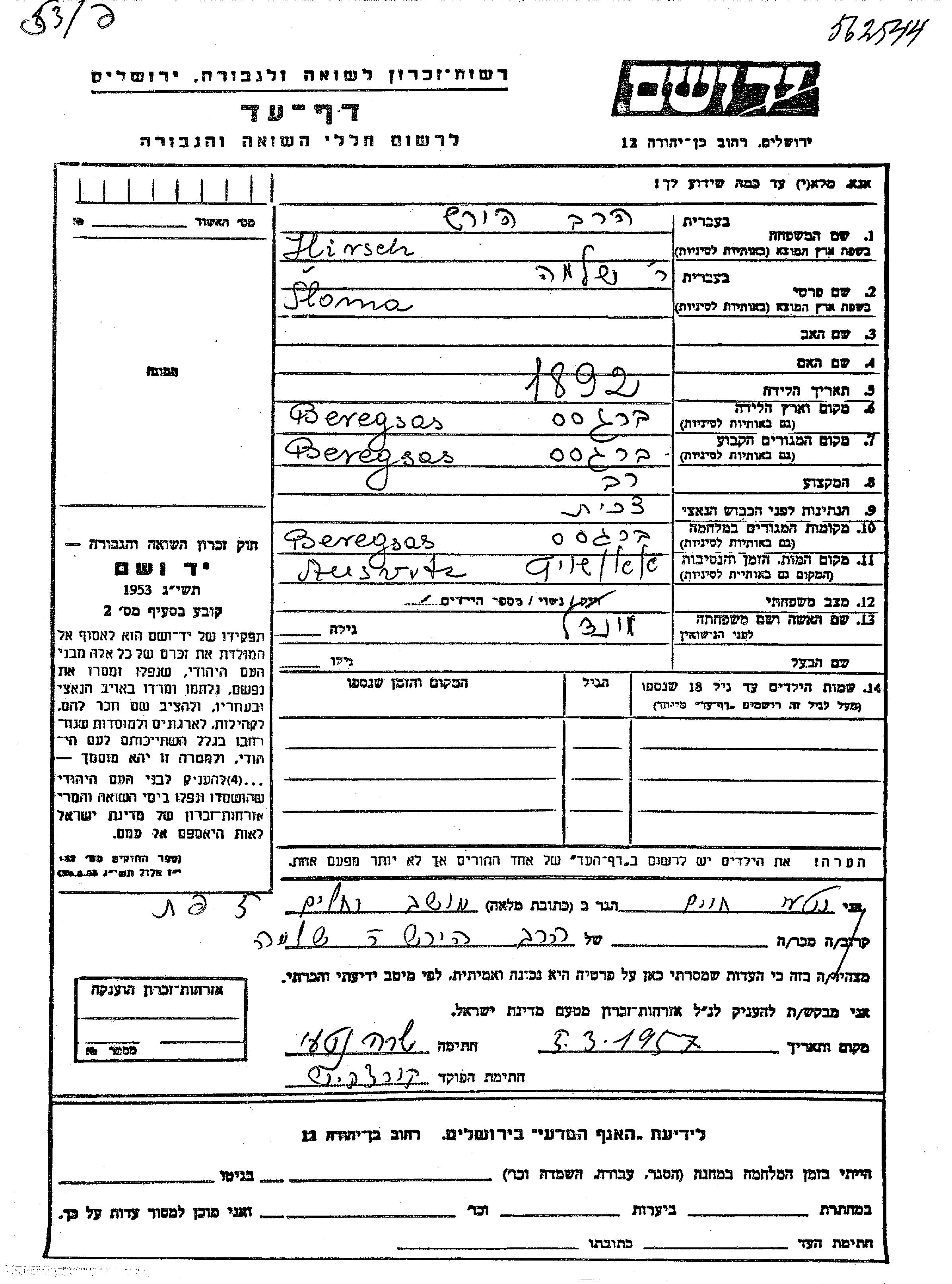 Раввин Слома Хирш, место рождения: Берегсас, Чехословакия. Раввин. Женат / замужем. Место жительства до войны: Берегсас, Чехословакия. Место во время войны: Берегсас, Чехословакия.
