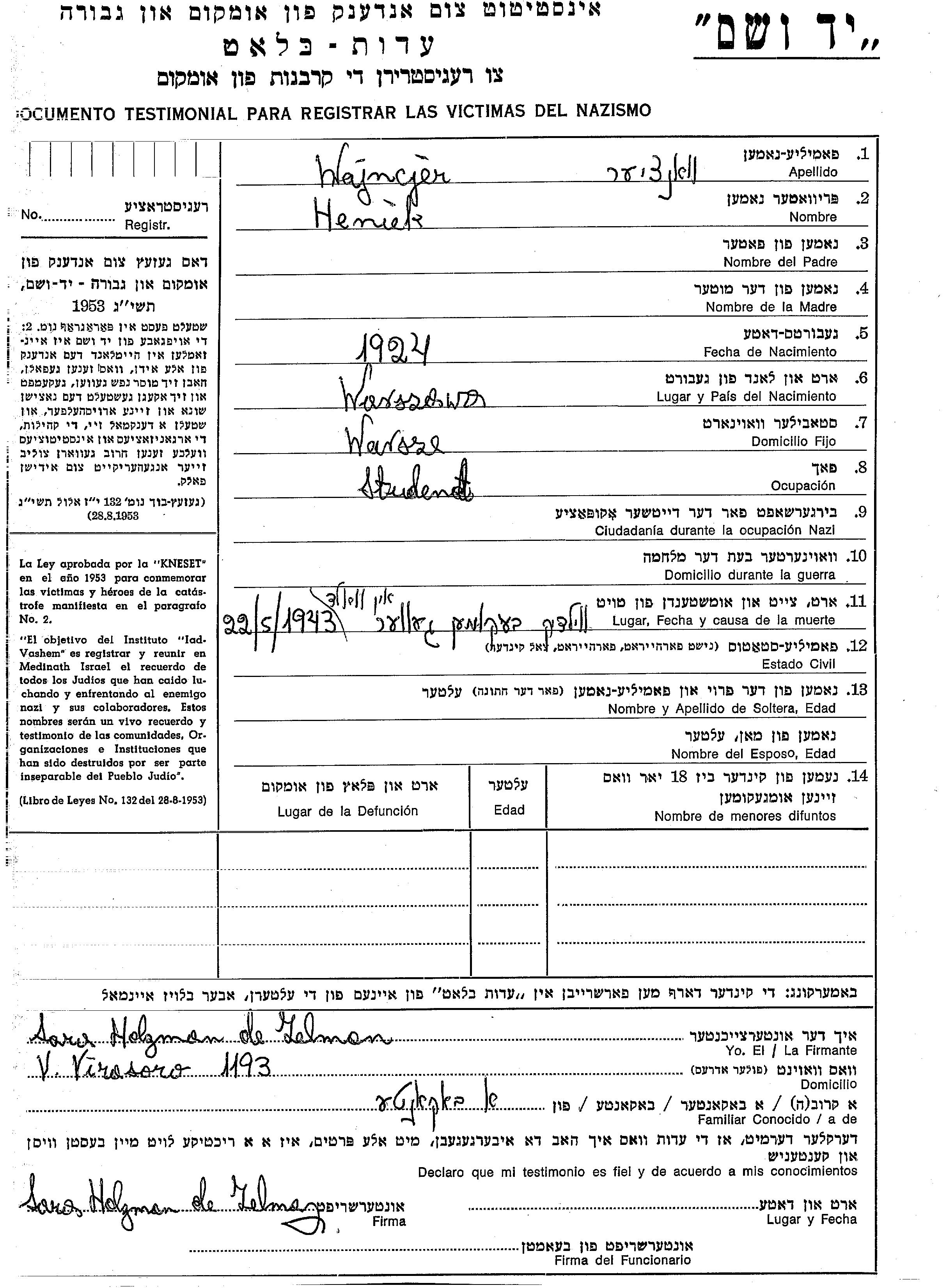 Хеник Вайнцьер, место рождения: Варшава, Польша. Студент / студентка. Место жительства до войны: Варшава, Польша.