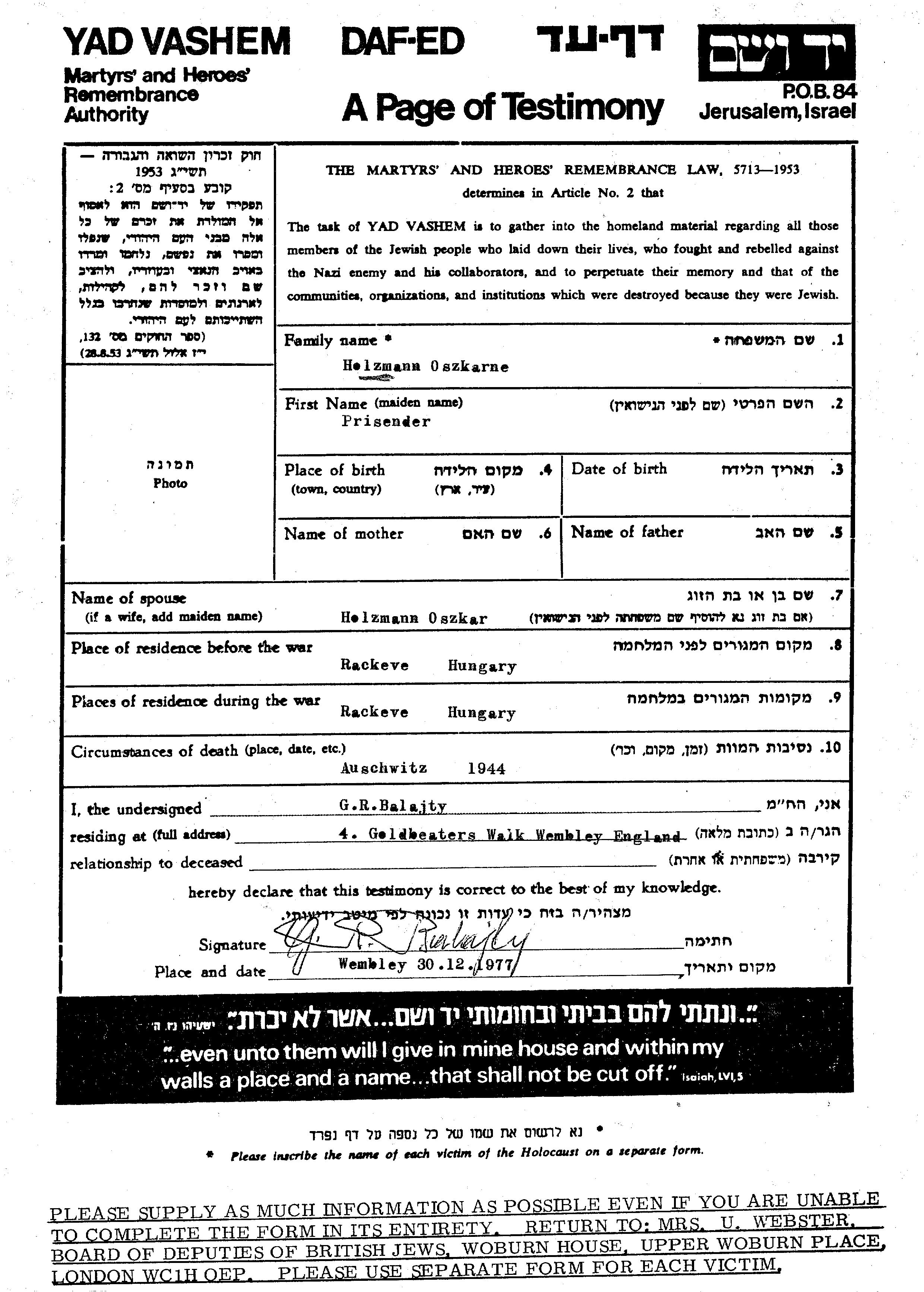 Имя неизвестно Хольцманн, девичья фамилия Призендер. Женат / замужем. Место жительства до войны: Рацкеве, Венгрия. Место во время войны: Рацкеве, Венгрия.