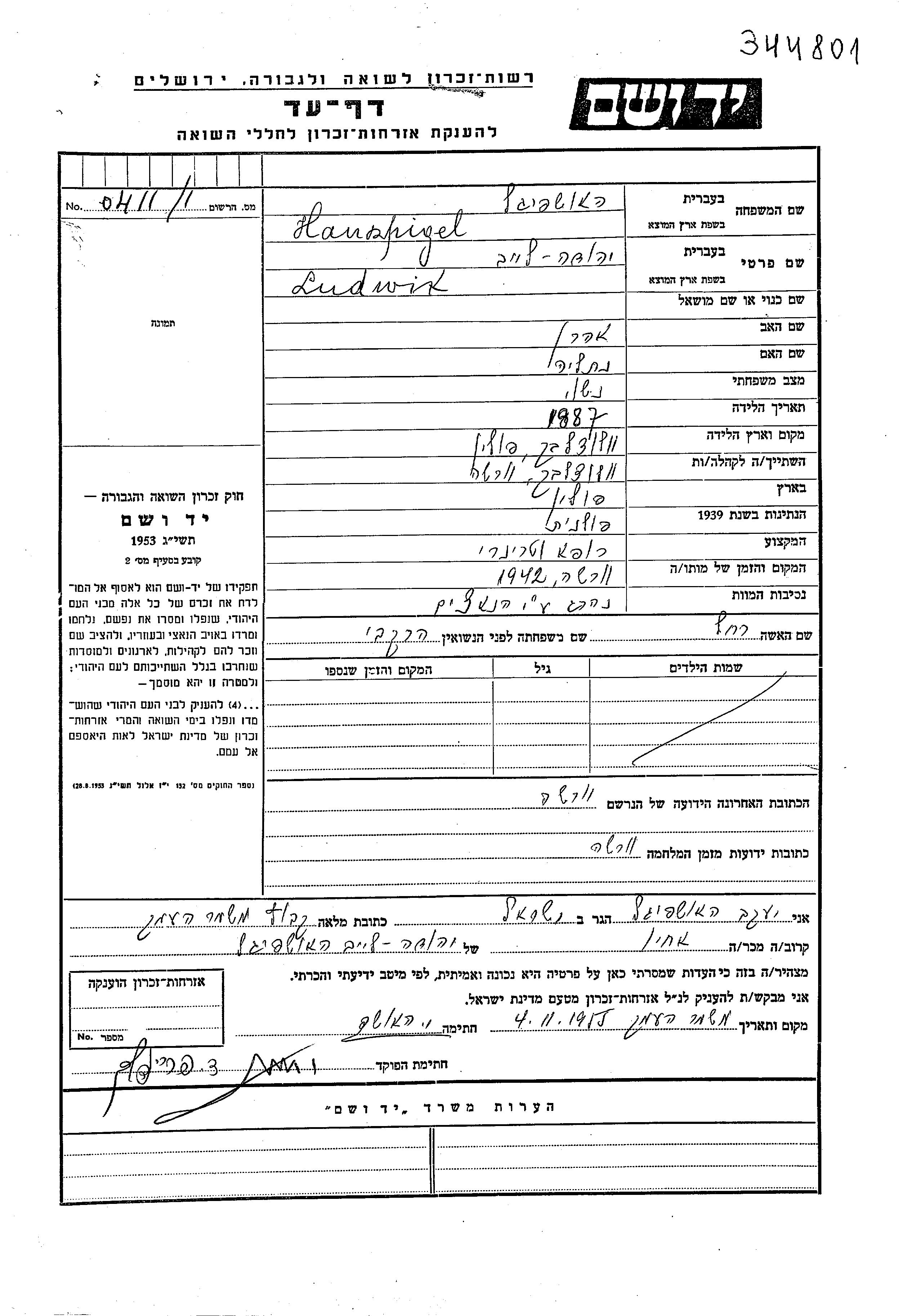 Хаушпигель Людвик Иегуда Лейб 1887 Варшава, Польша Лист свидетельских показаний