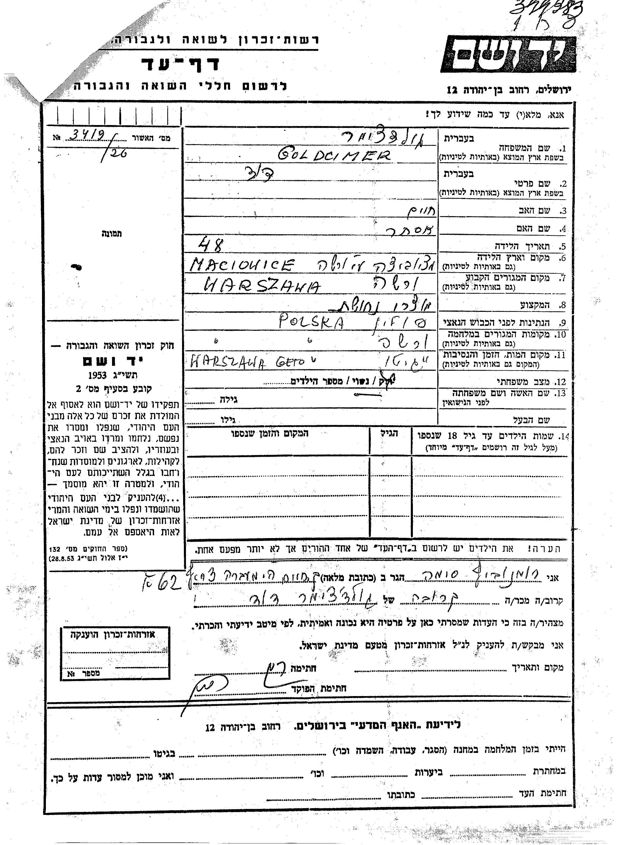 Давид Гольдцимер, место рождения: Мацеёвице, Польша. Отец: Хаим, mать:Эстер. מוצרי נחושת. Женат / замужем. Место жительства до войны: Варшава, Польша. Место во время войны: Варшава, Польша.