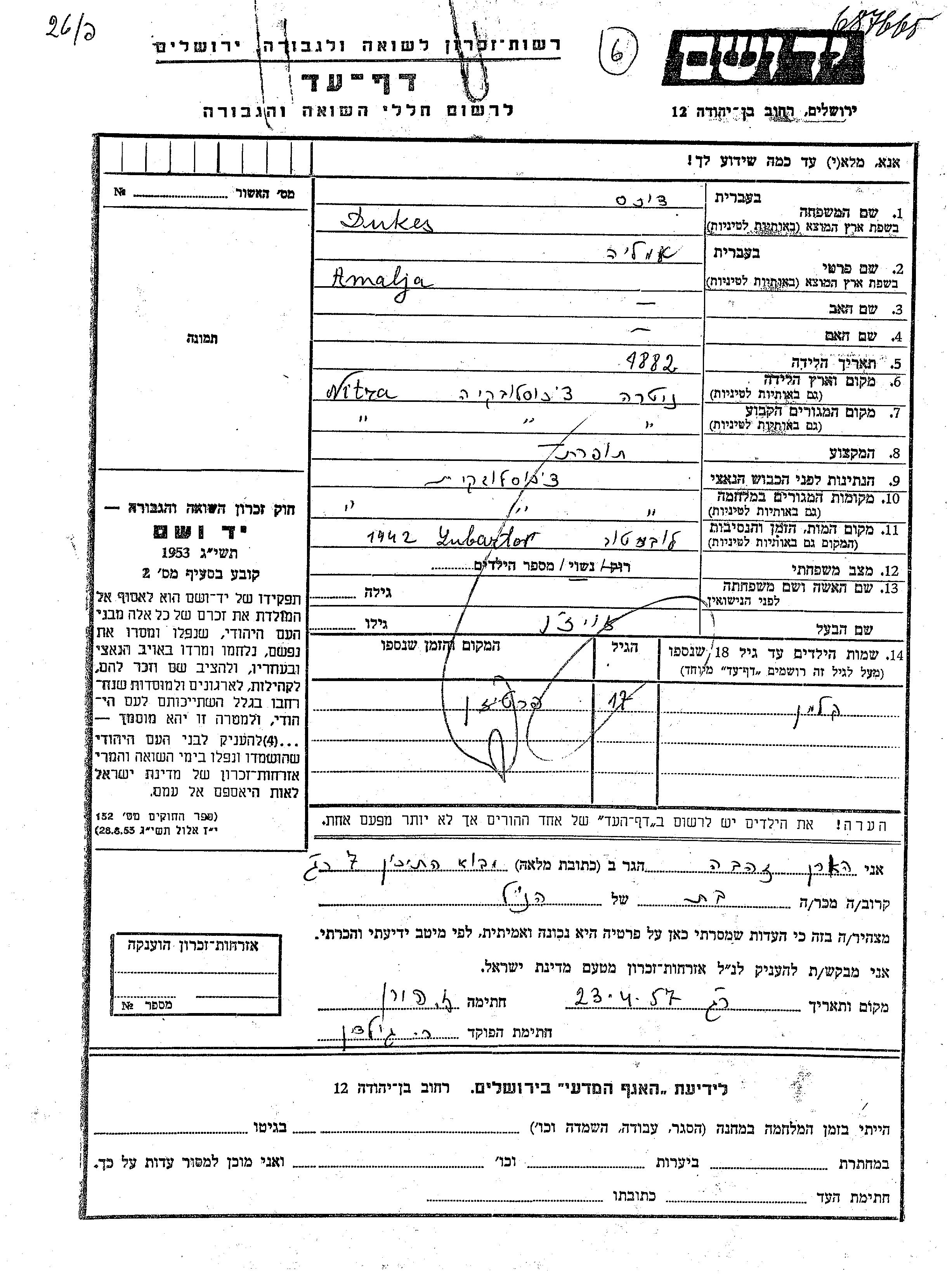 Амалия Дукес, место рождения: Нитра, Чехословакия. Швея. Женат / замужем. Место жительства до войны: Нитра, Чехословакия. Место во время войны: Нитра, Чехословакия.