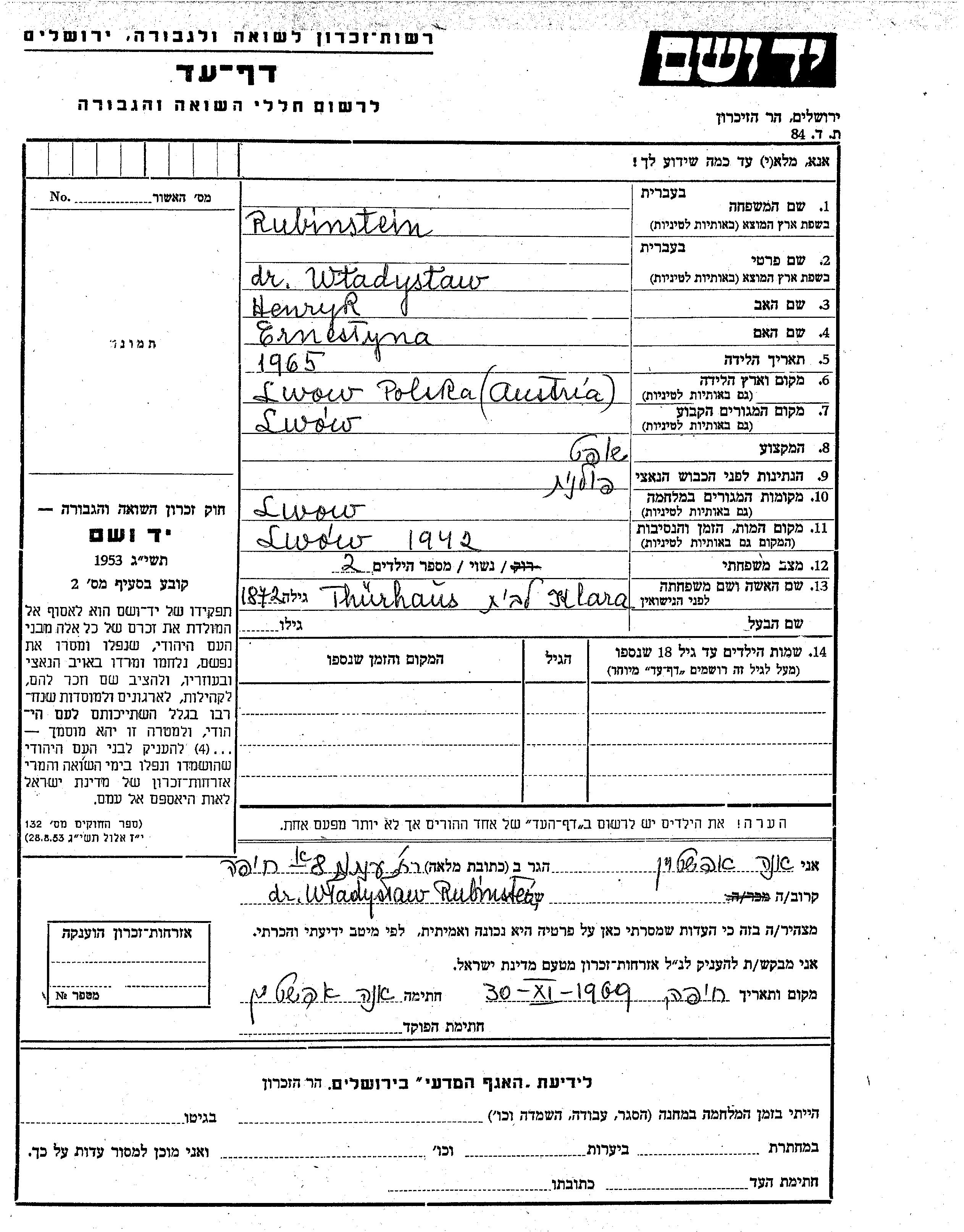 Др. Владислав Рубинштайн, место рождения: Львов, Польша. Отец: Хенрик, mать:Эрнестына. Судья. Женат / замужем. Место жительства до войны: Львов, Польша. Место во время войны: Львов, Польша.