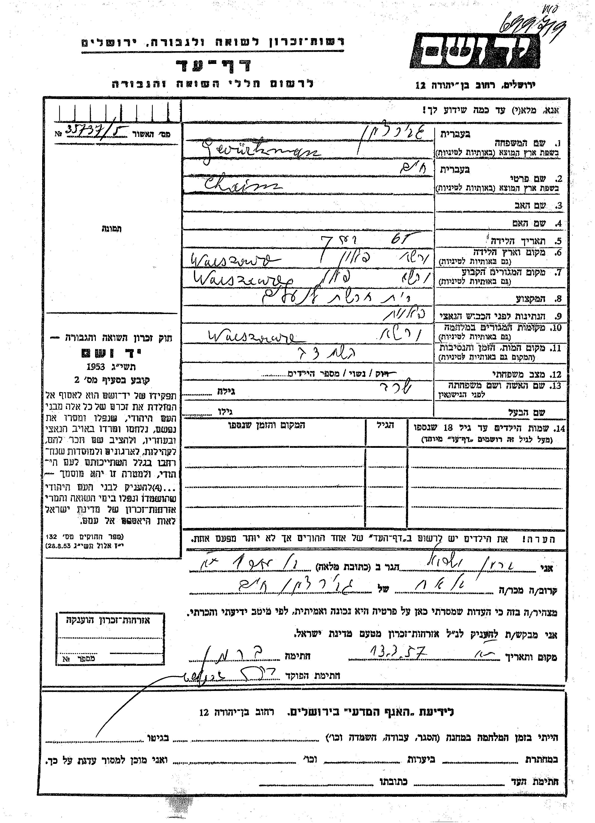 Хаим Гевурцман, место рождения: Варшава, Польша. Женат / замужем. Место жительства до войны: Варшава, Польша. Место во время войны: Варшава, Польша.