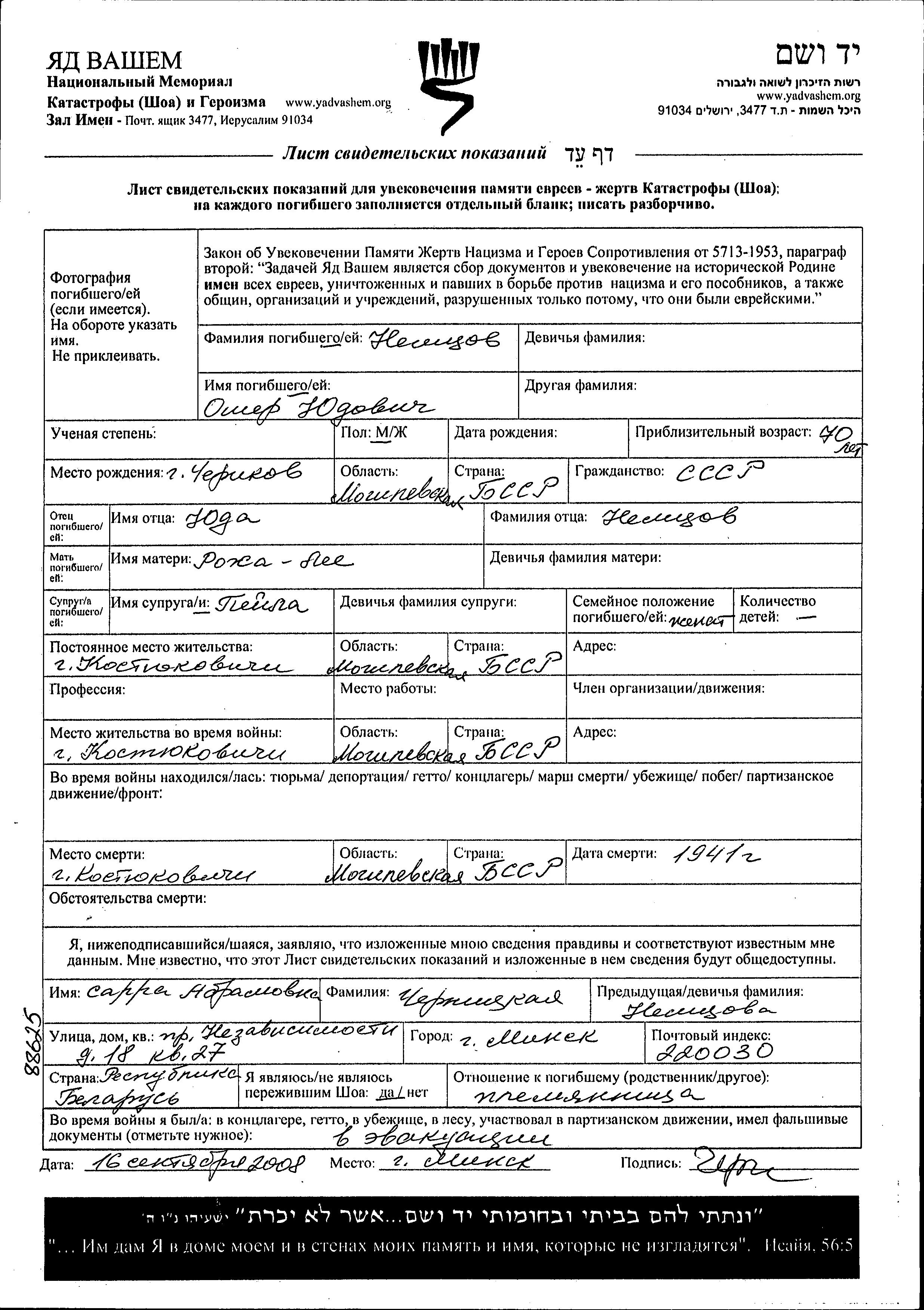 Немцов Ошер Костюковичи, Белоруссия (СССР) Лист свидетельских показаний
