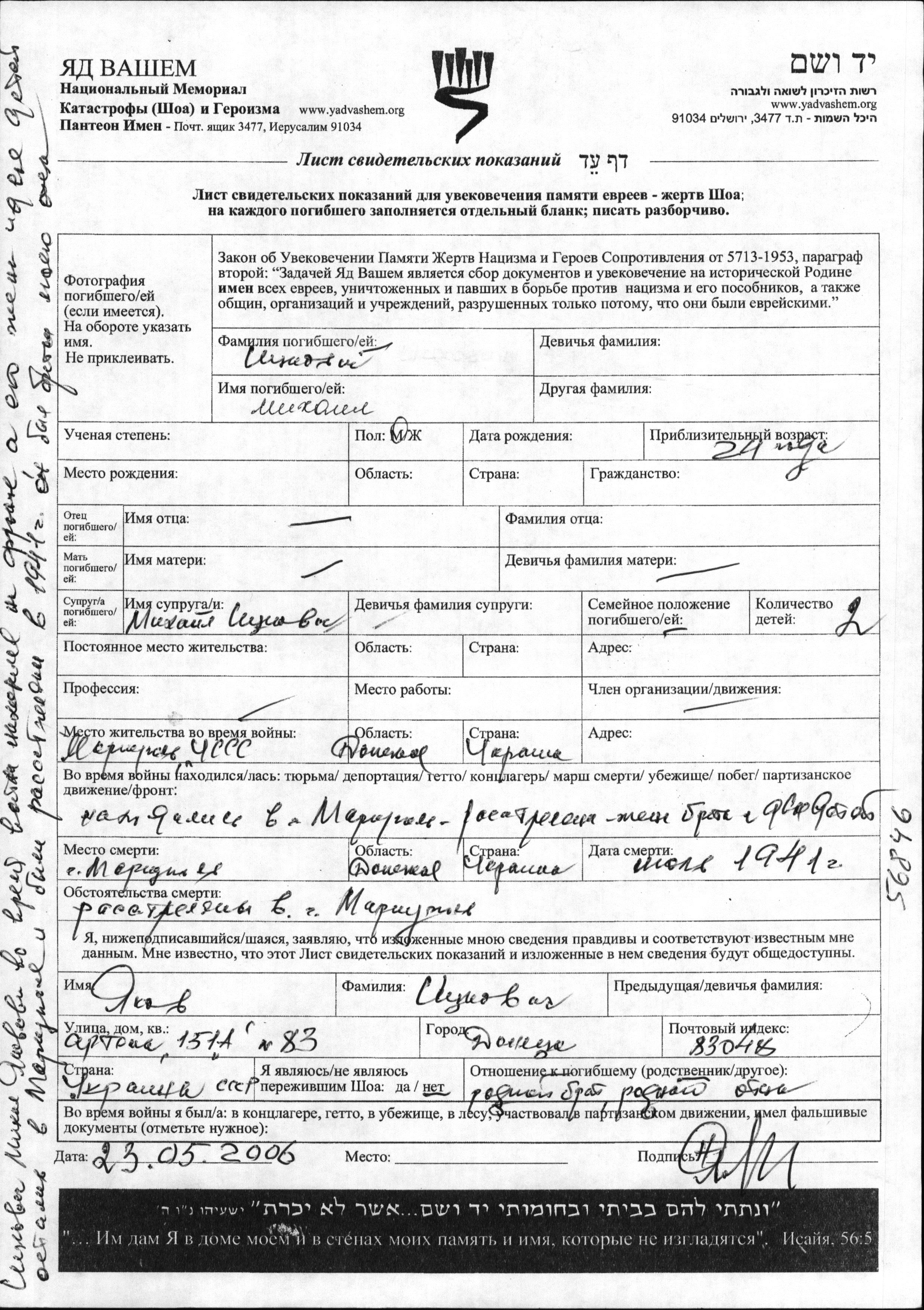 Ицкович Михаил Мариуполь, Украина (СССР) Лист свидетельских показаний