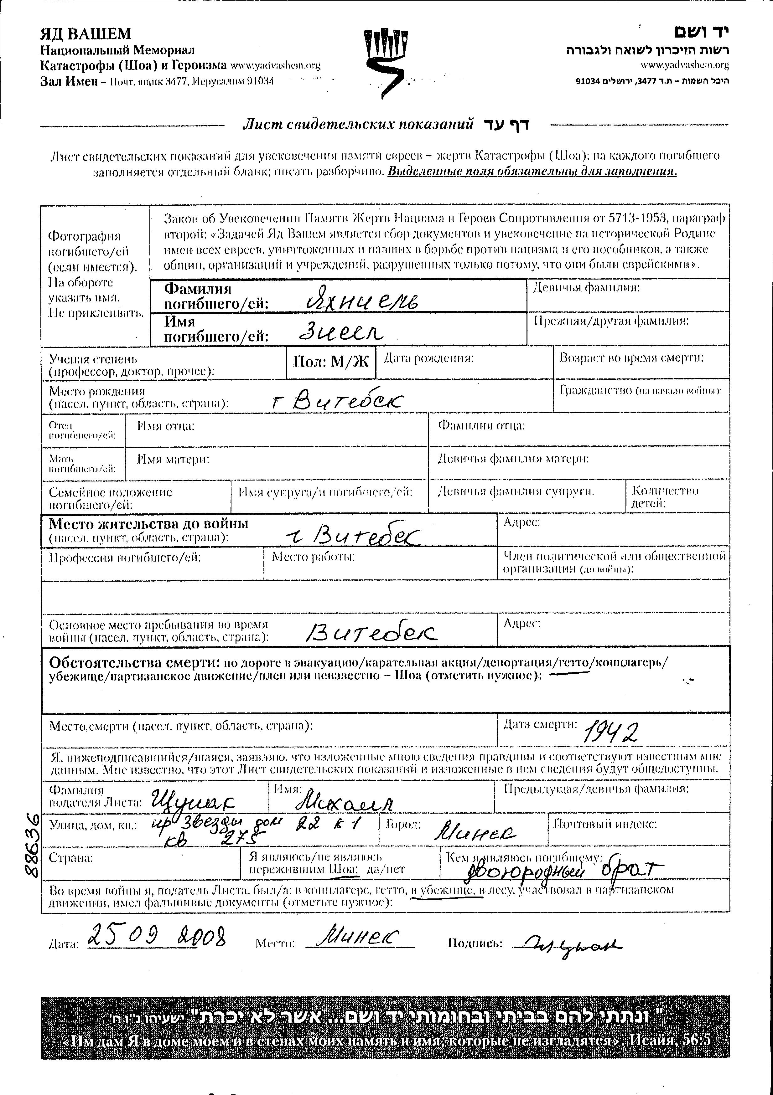 Яхниель Зисел Витебск, Белоруссия (СССР) Лист свидетельских показаний