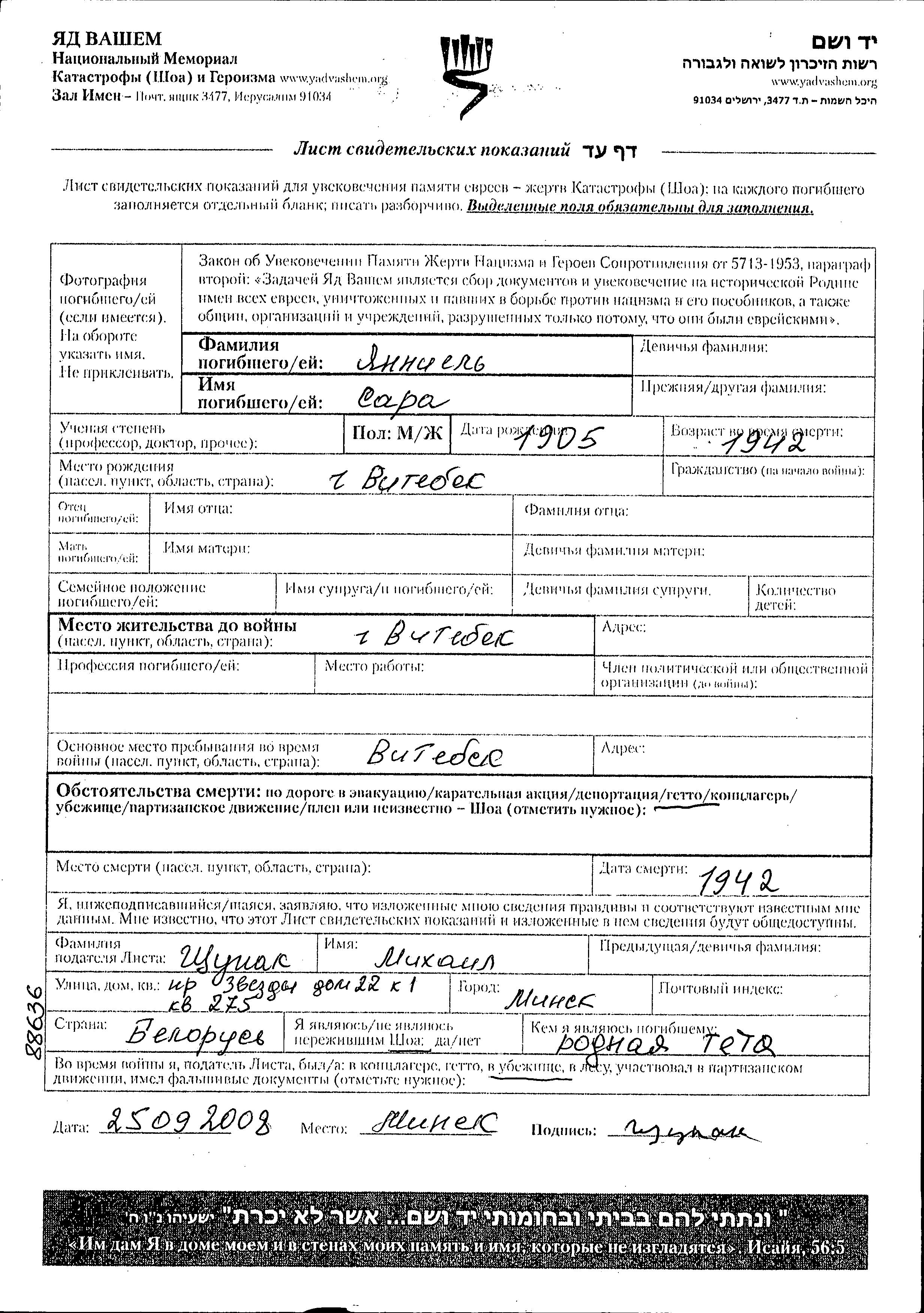 Яд Вашем - Листы свидетельских показаний Мемориального фонда