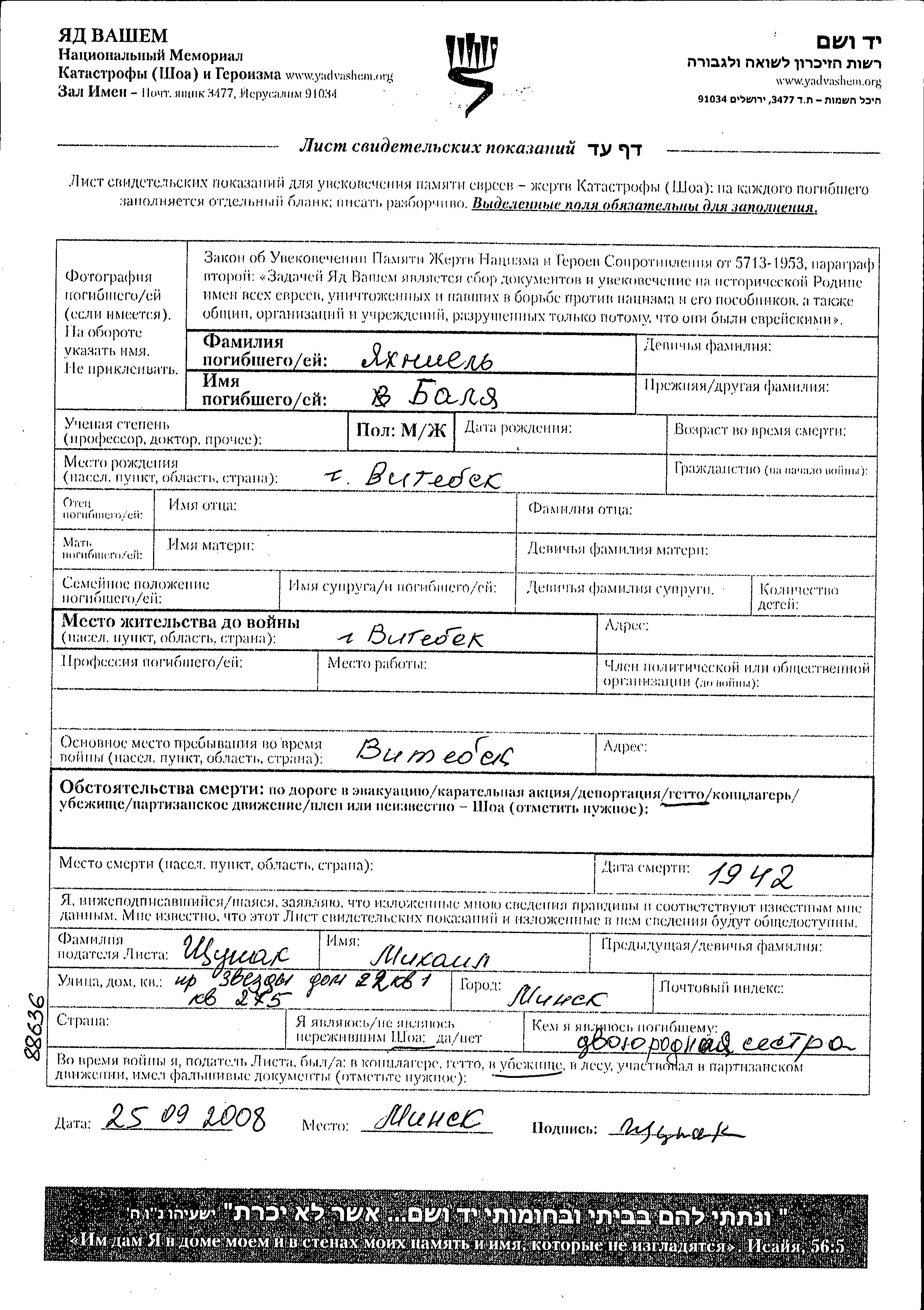 Яхниель Баля Витебск, Белоруссия (СССР) Лист свидетельских показаний