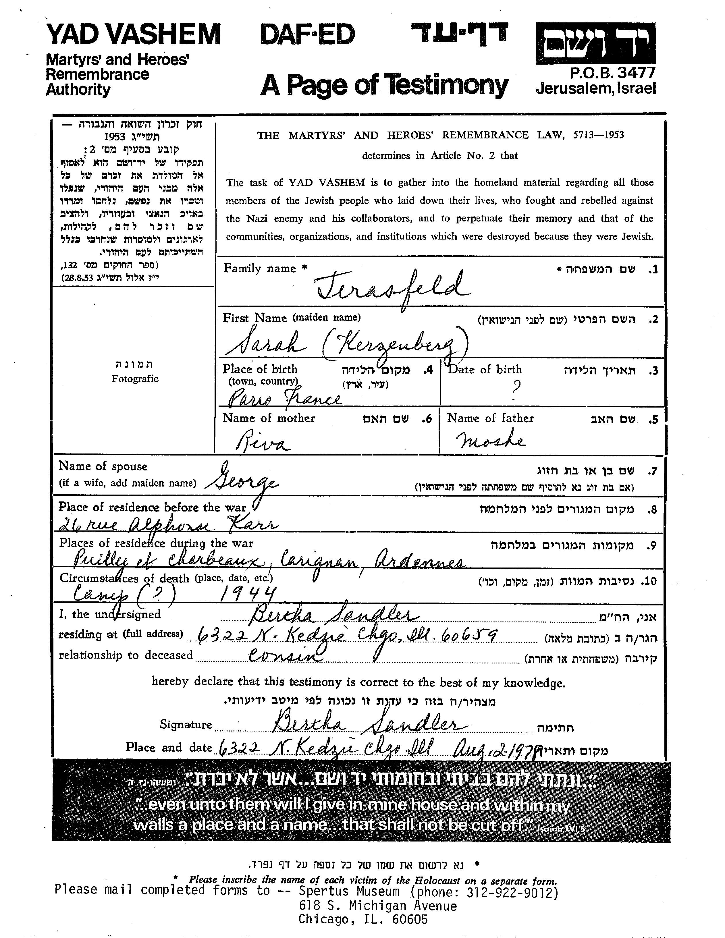 Сара Терасфельд, девичья фамилия Керценберг, место рождения: Париж, Франция. Отец: Моше, mать:Рива. Женат / замужем. Место жительства до войны: Париж, Франция. Место во время войны: Кариньян, Франция.
