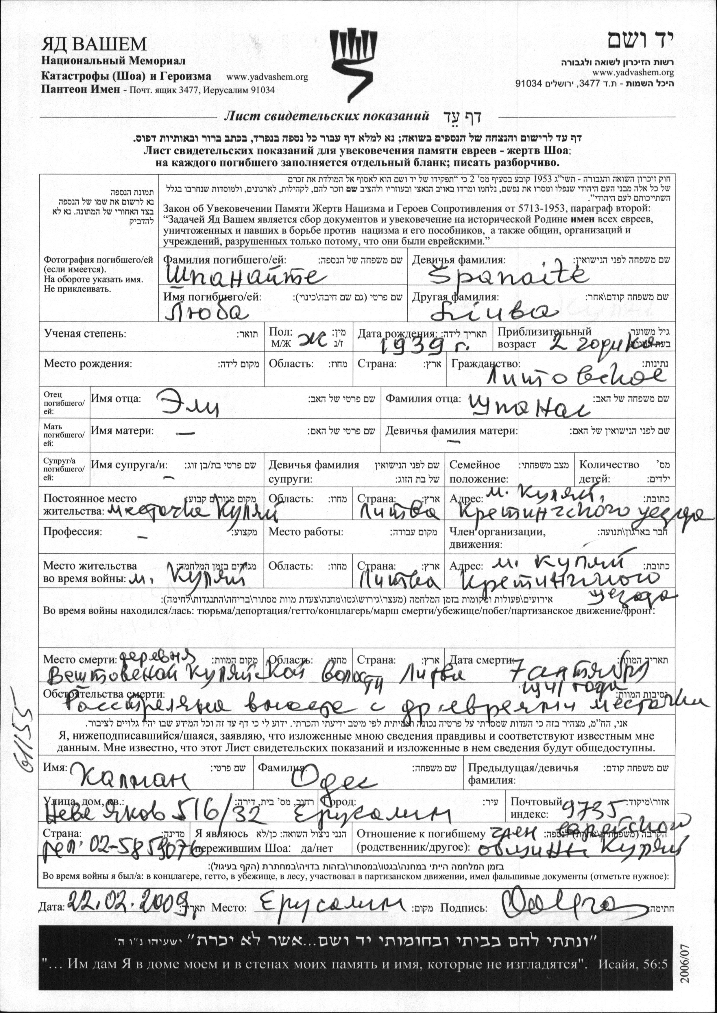 Шпанайте Люба 1939 Куляй, Литва Лист свидетельских показаний