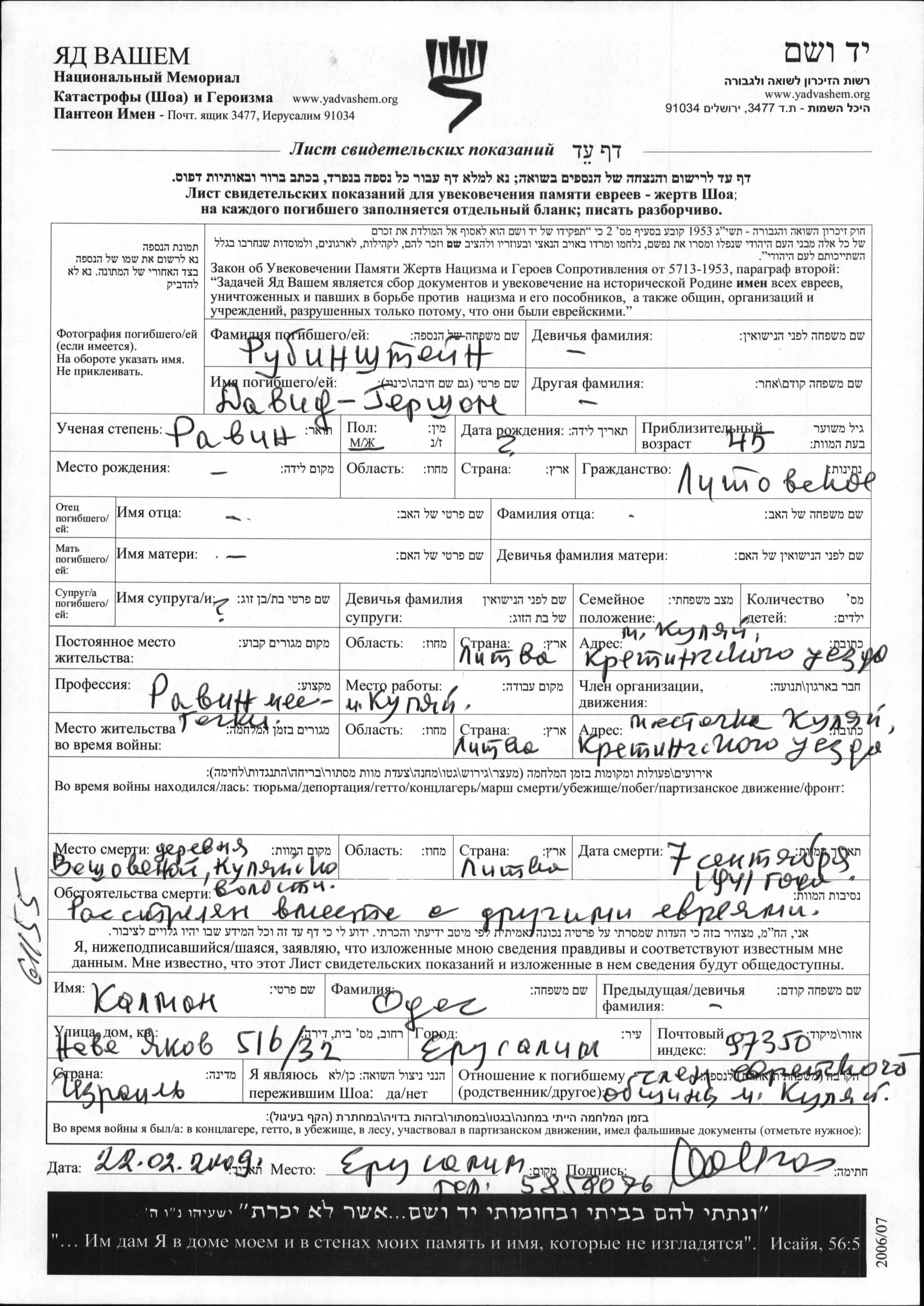 Яд Вашем - Листы свидетельских показаний Мемориального фонда